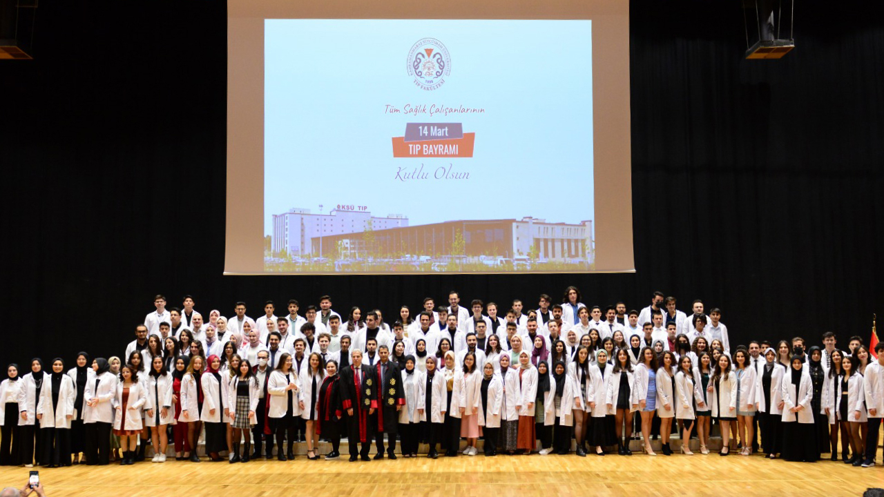 Multimedya gösteriminin ardından Vali Coşkun, Büyükşehir Belediye Başkanı Güngör, KSÜ Rektörü Can, protokol üyeleri ve akademisyenler tarafından Tıp Fakültesine 2021-2022 Akademik Yılında kayıt yaptıran öğrencilere beyaz önlükleri törenle giydirildi.