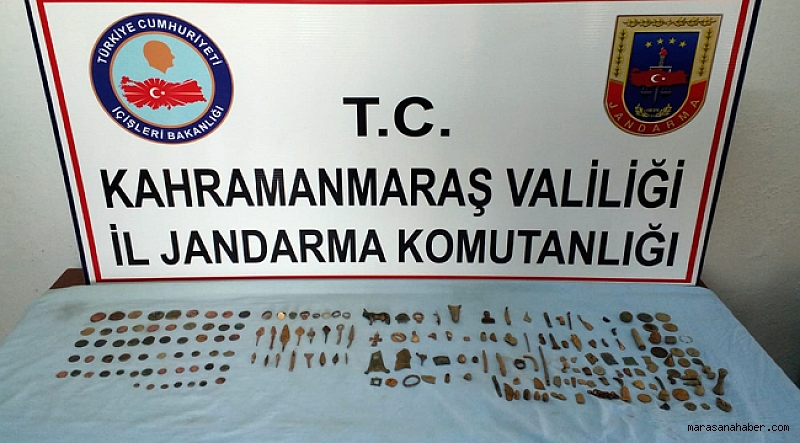 Kahramanmaraş ili afşin ilçesinde ellerinde bulundurdukları tarihi eserleri satmak için müşteri arayan 2 kişi jandarma ekiplerince yakalandı.Olay Afşin’in Karagöz Mahallesinde meydana geldi. edinilen bilgilere göre; Y.G ve F.S isimli şahısların ellerinde çok miktarda tarihi eser bulunduğunu ve satmak için müşteri aradıklarını öğrenen jandarma ekipleri, olayla ilgili çalışma başlattı. Adli makamlardan arama kararı çıkaran Kahramanmaraş İl J.K.lığı İstihbarat Şube Müdürlüğü, KOM Şube Müdürlüğü ve Afşin İlçe Jandarma Komutanlığı’nca 30 Temmuz Pazartesi günü Afşin ilçesi karagöz mahallesi girişinde müşterek operasyon başlatıldı. Operasyon sunucunda, bir araç içerisinde Roma dönemine ait olduğu değerlendirilen (58) adet sikke, (8) adet yüzük, (14) adet ok ucu, (1) adet haç kolye, (1) adet boğa heykeli ve (117) adet muhtelif cins ve ebatlarda tarihi obje ele geçirilirken; olayla ilgili Y.G ve F.S isimli şahıslar yakalanarak haklarında yasal işlem başlatıldı.