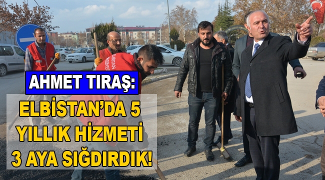 Elbistan Belediye Başkan Vekili Ahmet Tıraş, ak parti Genel Başkan Yardımcımız Mahir Ünal'ın destekleriyle Elbistan’da 5 yıllık hizmeti 3 aya sığdırdıklarını belirttti.16 Kasım 2018 tarihinden itibaren Meclis Üyeliği görevinden Elbistan Belediye Başkan Vekilliği görevine başlayan ahmet tıraş geçirdiği 3 aylık hizmet dönemi hakkında yazılı bir açıklama yaptı.Elbistan Belediye Meclisi Olağanüstü toplantı sonrası meclis üyeliği görevinden Belediye Başkan Vekilliği görevine başlayan Ahmet Tıraş, "AK Parti Genel Başkan Yardımcımız Mahir Ünal'ın destekleri ile 5 yıllık hizmeti 3 aya sığdırdık" dedi.