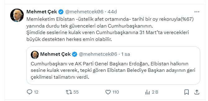 Çek, ikinci bir paylaşımında da; “Memleketim Elbistan -üstelik afet ortamında- tarihi bir oy rekoruyla(%67) yanında durdu tek güvenceleri olan Cumhurbaşkanının. Şimdide seslerine kulak veren Cumhurbaşkanına 31 Mart’ta verecekleri büyük destekten herkes emin olabilir” ifadelerine yer verdi.