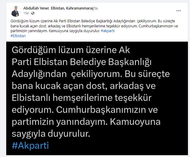 AK Parti Elbistan Belediye Başkan Adayı Abdullah Yener de sosyal medya hesabından paylaşım yaparak adaylıktan çekildiğini duyurdı.