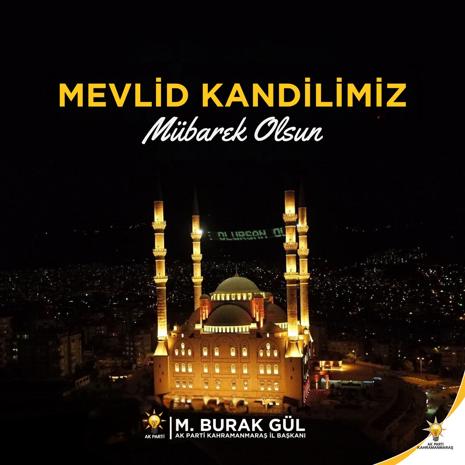 Mevlid Kandili dolayısıyla mesaj yayımlayan AK Parti Kahramanmaraş İl Başkanı M.Burak Gül, Kahramanmaraş halkının ve İslam aleminin Mevlid Kandilini tebrik etti.