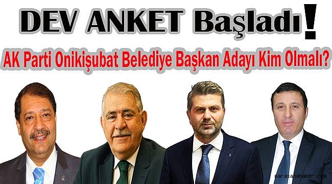 ANKETE KATILMAK İÇİN LÜTFEN TIKLAYIN!31 Mart 2019’da gerçekleştirilecek olan yerel seçimlere yaklaşık 5,5 ay kaldı. Siz de Kahramanmaraşlı vatandaşlar olarak kentinizde bu seçimde AK Parti Onikişubat Belediye Başkan Adayı olarak kimleri görmek istersiniz?Kahramanmaraş’ta ilk belirlemelere göre; Onikişubat Belediye Başkanlığına AK Parti’den aday adayı olacak 4 isim var. Bu isimler arasında mevcut Onikişubat Belediye Başkanı Hanefi Mahçiçek dâhil, AK Parti Onikişubat İlçe Başkanı Fırat Görgel, İşadamı Mehmet Sabancı ve İşadamı Mustafa Buluntu bulunuyor. Maraş Ana haber olarak bu isimlerin yer aldığı bir anket hazırladık. Siz de bu seçimde hangi ismin AK Parti Onikişubat Belediye Başkan Adayı olmasını istiyorsanız; tıklayın ankete oy verin!ANKETE KATILMAK İÇİN LÜTFEN TIKLAYIN!