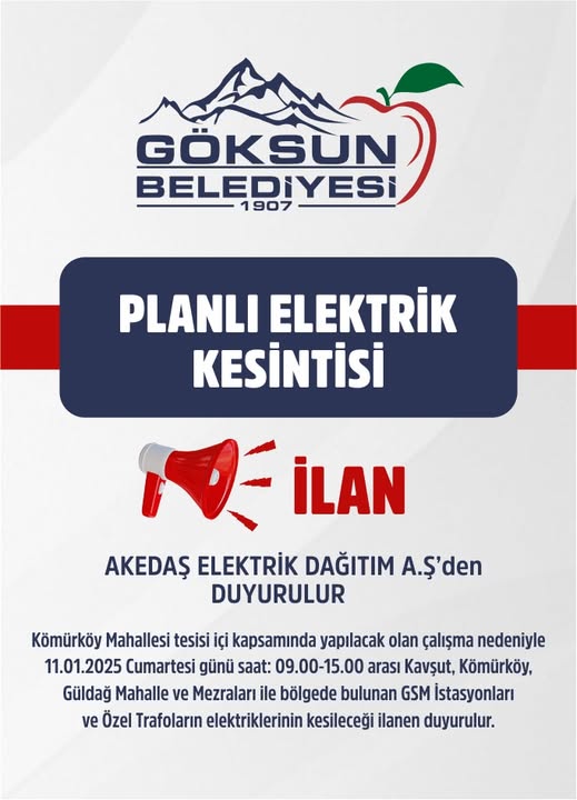 Yapılacak olan bakım ve onarım çalışmaları nedeniyle 11 Ocak Cumartesi günü saat 09.00 ile 15.00 arasında Kavşut, Kömürköy, Güldağ Mahalleleri ve bu mahallelerdeki mezralar ile bölgede bulunan GSM istasyonları ve özel trafoların elektrik enerjisi kesilecektir.AKEDAŞ Elektrik Dağıtım A.Ş., elektrik kesintisinin planlı bir çalışma olduğunu belirterek, vatandaşların mağduriyet yaşamamaları için belirtilen saatler arasında elektrik kullanımını düzenlemeleri gerektiğini duyurdu.