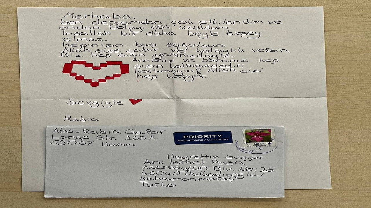 6 Şubat depremlerinin ardından şehrin tekrar ayağa kaldırılması noktasında tüm alanlarda çalışmalar sürerken bir yandan da şehre yardımlar gelmeye devam ediyor. Şehrin imarı ve inşası noktasında kamu kurumları, çeşitli sivil toplum kuruluşları ve gönüllülerin yardım seferberliği sürerken Almanya’nın Hamm kentinden mektup eşliğinde bir zarfla gönderilen bağış ise duygulandırdı. Rabia Gafar, Kahramanmaraş Büyükşehir Belediye Başkanı Hayrettin Güngör’e ithafen kaleme aldığı mektupta, “Merhaba, ben depremden çok etkilendim ve ondan dolayı çok üzüldüm. İnşallah bir daha böyle bir şey olmaz. Hepinizin başı sağ olsun. Allah size sabır ve kolaylık versin. Biz hep sizin yanınızdayız. Anneniz ve babanız hep sizin kalbinizdedir. Korkmayın! Allah sizi hep koruyor. Sevgiyle” ifadelerine yer verdi. “Kocaman Yüreklerden Çıkan Mektuplar Aldık”Başkan Hayrettin Güngör, Rabia Gafar’ın duygu yüklü mektubunu sosyal medya hesabından, “Büyük felaketin ardından onlarca paha biçilemez yardım ve bunlarla birlikte kocaman yüreklerden çıkan mektuplar aldık. Onlardan birisi de Almanya’daki yavrumuz Rabia’nın gönderdiği mektup ve harçlığıydı. Gözlerinden öpüyorum güzel yavrum. Allah seni ailene bağışlasın” ifadeleriyle paylaştı.