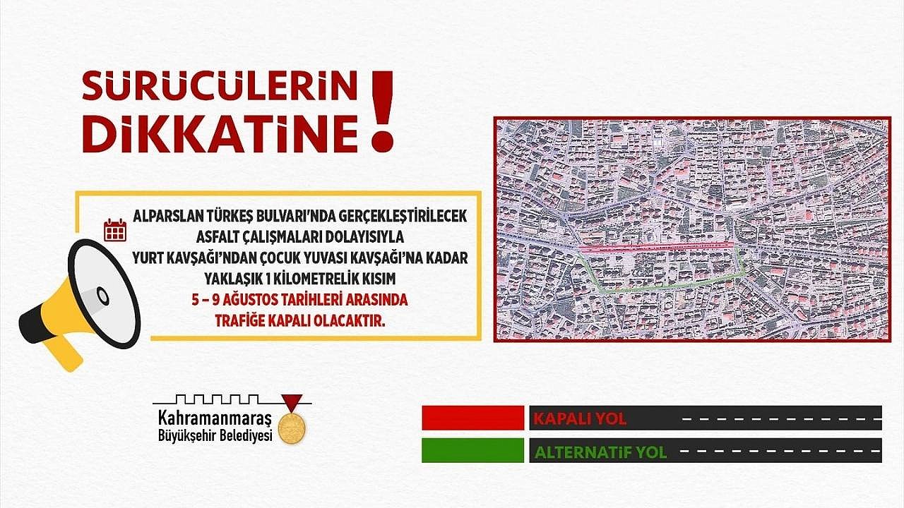 Binevler Bölgesi Cadde Yenileme projesi kapsamında Alparslan Türkeş Bulvarı’nda ikinci etap çalışmalarını da tamamlayan Kahramanmaraş Büyükşehir Belediyesi, caddenin kalan kısımlarının da asfaltını yeniliyor. Yurt Kavşağı’ndan Çocuk Yuvası Kavşağı’na kadar yaklaşık 1 kilometrelik kısımda gerçekleştirilecek asfalt çalışmaları dolayısıyla cadde 5 – 9 Ağustos tarihleri arasında trafiğe kapalı olacak.