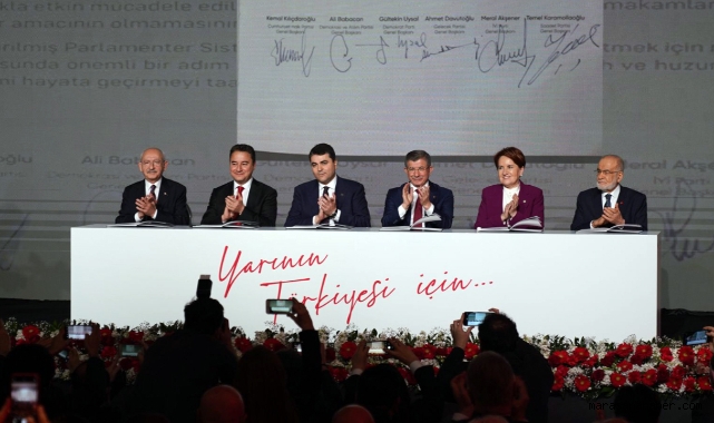 DEVA Partisi Genel Başkanı Ali Babacan, chp Genel Başkanı Kemal Kılıçdaroğlu, Demokrat Parti Genel Başkanı Gültekin Uysal, Gelecek Partisi Genel Başkanı Ahmet Davutoğlu, İYİ Parti Genel Başkanı Meral Akşener ve Saadet Partisi Genel Başkanı Temel Karamollaoğlu Güçlendirilmiş Parlamenter Sistem için oluşturdukları mutabakat metnini imzaladı.