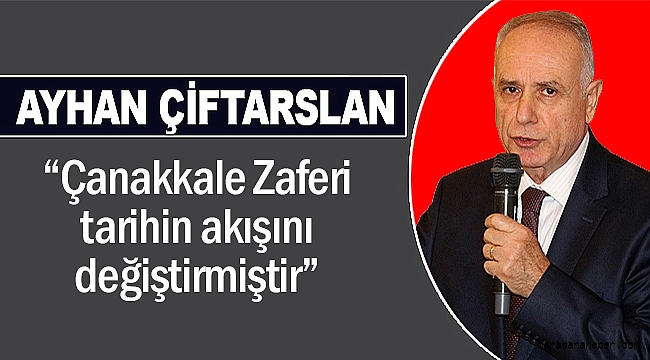 Ayhan Çiftarslan, mesajında 18 Mart Çanakkale zaferinin yıl dönümün 104. yılını kutlandığını hatırlatarak, "Yüce Türk Milletini yok etmeye ve topraklarımızı işgale kalkışan dönemin güçlü devletlerine karşı, Büyük Türk Milletinin ve kahraman askerlerimizin Çanakkale’de vermiş olduğu eşsiz mücadelenin ve kazandığımız zaferin 104. yıldönümünü kutlamanın gurur ve mutluluğunu yaşıyoruz. Çanakkale Zaferi, tarihin akışını ve Türk Ulusunun kaderini değiştiren çok önemli bir başarıdır. Türk Milletinin neleri başarabileceğinin en güzel kanıtıdır. Tarihte eşine az rastlanır çok uluslu güce karşı kanları ve canları pahasına dur diyen ve tüm dünyaya Çanakkale Geçilmez dedirten Büyük Türk Milleti ve onun bağrından çıkan kahraman askerleri, dün Çanakkale de olduğu gibi bugün de ülkesine ve milletine yönelik her türlü tehdidi bertaraf edebilecek güç ve kararlılıktadır. Bu duygularla Çanakkale Şehitleri ve vatan toprakları için can vermiş olan tüm şehitlerimizi saygı ile anıyorum" ifadelerini kullandı.
