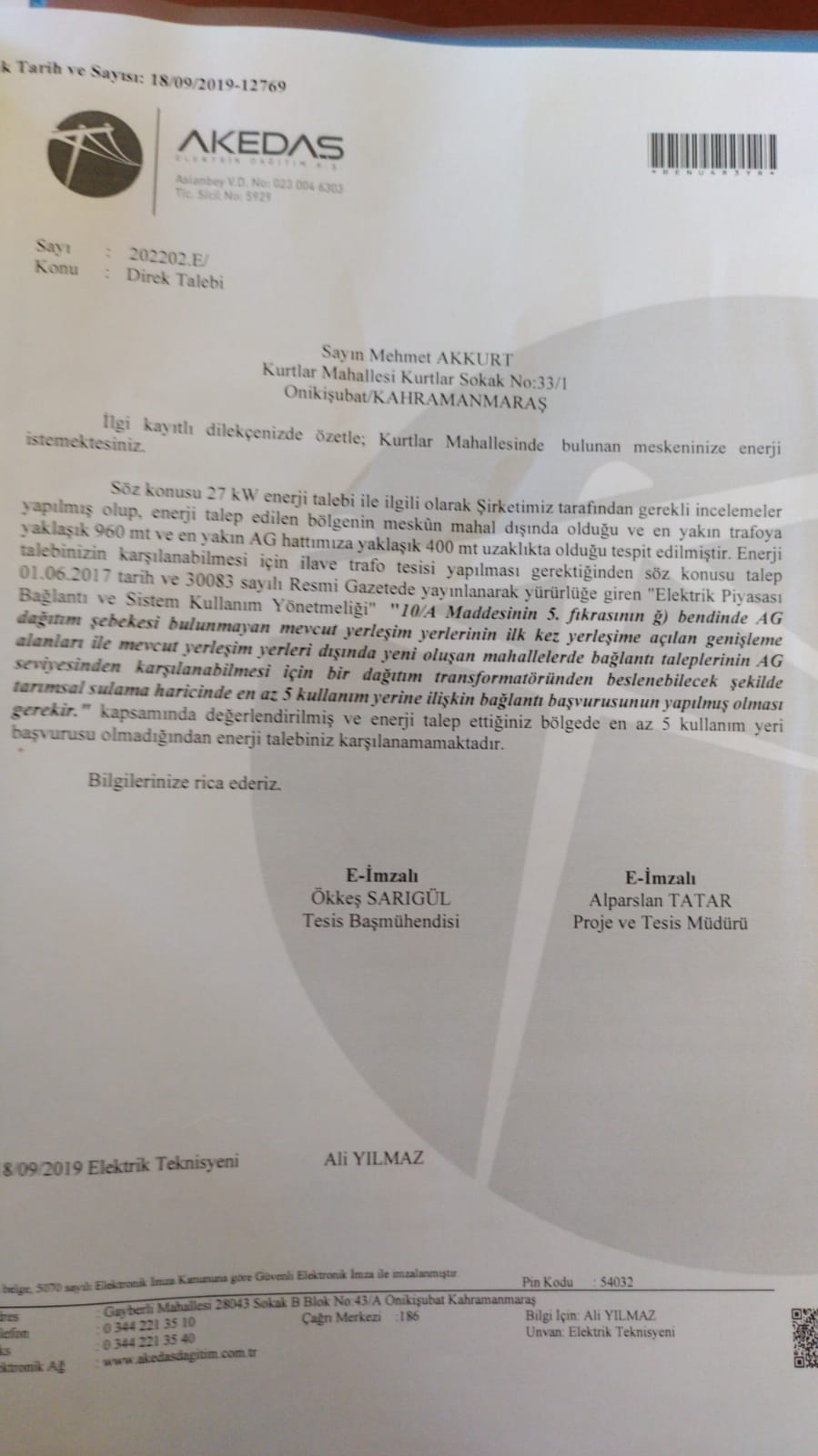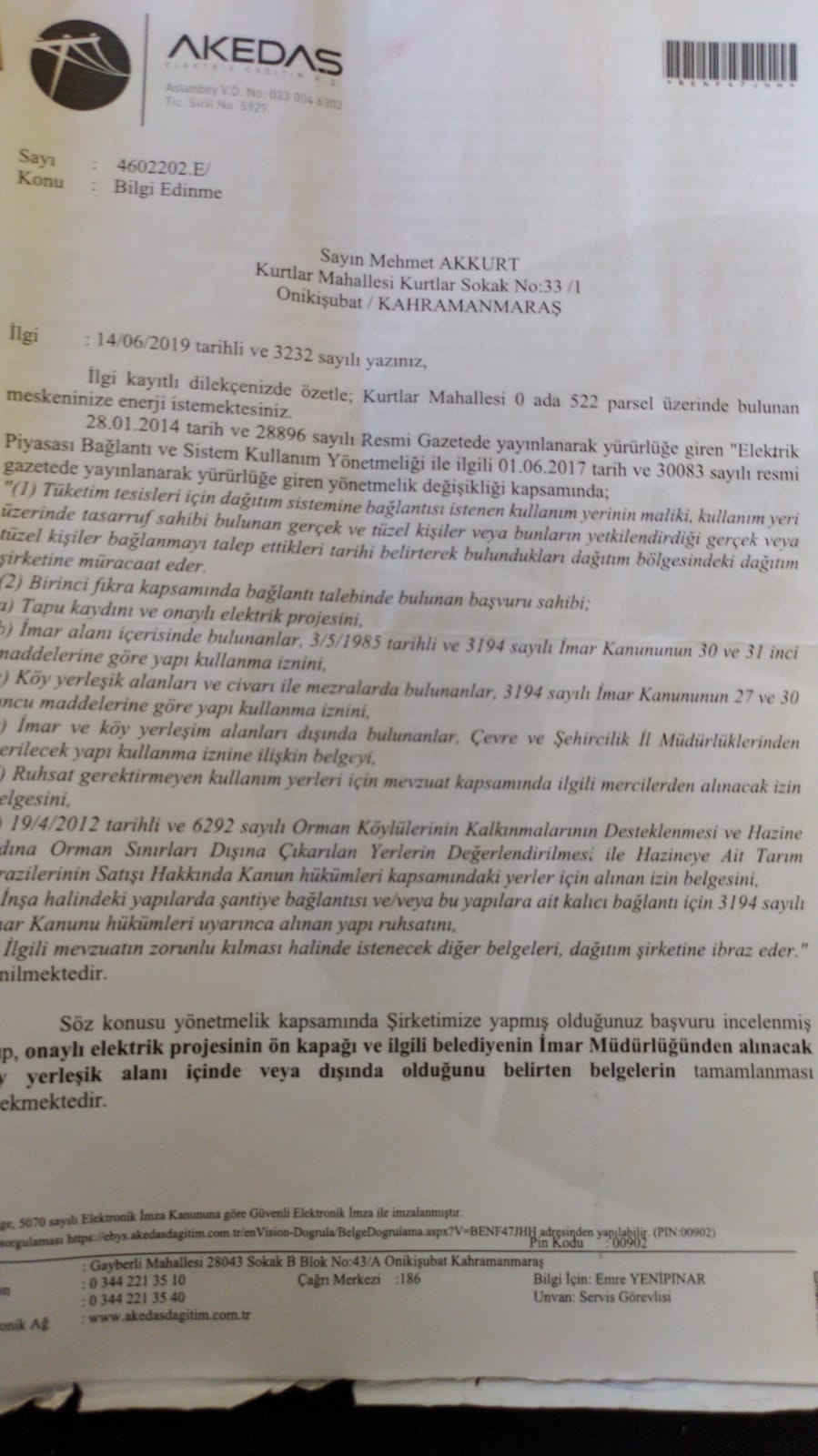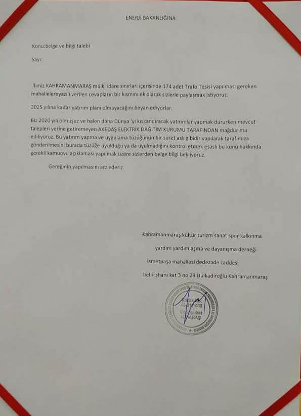 Kahramanmaraş Kültür Turizm Sanat Spor Kalkınma Yardım Yardımlaşma ve Dayanışma Derneği (KARDER) Başkanı Ali Akkurt, Kahramanmaraş’ta elektriksiz kalan birçok yerleşim yeri ve tarımsal alanın bulunduğunu ve elektrik dağıtım şirketinin buralara elektrik götürmediğini belirtti.Akkurt, geçtiğimiz günlerde Kahramanmaraş’ta elektriksiz yerleşim yerinin kalmadığını duyuran elektrik dağıtım şirketi AKEDAŞ’a cevap verdi.Başkan Akkurt’un açıklaması şöyle:Milliyetçi Hareket Partisi (MHP) kahramanmaraş Milletvekili Prof. Dr. Sefer Aycan’ın kentteki ev ve işyerlerine elektrik bağlanması üzerine verdiği soru önergesine Enerji ve Tabii Kaynaklar Bakanlığı’ndan yanıt geldi. Bakanlıktan gelen cevapta; Kahramanmaraş’ta elektrik bağlanmayan herhangi bir yerleşim yerinin olmadığı bildirildi.MHP milletvekili Sayın Sefer Aycan’a verilen cevaptan Enerji Bakanlığı'nın Kahramanmaraş'tan haberi yok ya da araştırmadan ‘Kahramanmaraş'ta elektrik olmayan yer yoktur’ denilmiştir.Enerji Bakanlığı’ndan EPDK enerji mevzuatının aslı gibidir diye suret istedik. AKEDAŞ ile karşılaştırmak için bize verilen cevap AKEDAŞ’tan geldi. Neden Enerji Bakanlığı cevap yazmamış çözemedim.Bizim Enerji Bakanlığı’na yazdığımız dilekçeye AKEDAŞ Elektrik Dağıtım şirketinin cevap verme konusunda haklı bir gerekçesi var mı?Enerji Bakanlığına yazdığımız dilekçeye ek olarak Kahramanmaraş’ta AKEDAŞ’ın 2020 yılı yatırım planı ve EPDK mevzuatın aslını aslı gibidir belgesinin tarafımıza gönderilmesini talep ederek dilekçe göndermiştik. Ama dilekçemize cevaben Enerji Bakanlığı değil de AKEDAŞ cevap gönderiyor. EPDK mevzuatının aslını göndermiyorlar.Enerji Bakanlığı ve EPDK Başkanı Kahramanmaraş Kültür Sanat Spor Kalkınma Yardım Yardımlaşma ve Dayanışma Derneği dilekçelerini neden incelemeden direk ilgili kuruma göndererek hangi tür mevzuat dışına çıkan kanunları saklıyor?Mevzuat diyor ki:a) Meskun mahal içinde bulunan kullanım yerlerine yönelik bağlantı taleplerinin, bağlantı anlaşmasının imzalandığı tarihten itibaren;1) Sadece AG bağlantı hattının gerekli olduğu durumlarda 2 (iki) ay,2) Mevcut AG şebekesinde kapasite artışı veya ilave tesis yapılması gereken durumlar ile mevcut dağıtım transformatörü tesisinde güç artışı yapılması gereken durumlarda 4 (dört) ay,3) Yeni bir dağıtım transformatörü veya dağıtım merkezi yapılması gereken durumlarda 6 (altı) ay,4) Sadece OG bağlantı hattının gerekli olduğu durumlarda 4 (dört) ay,5) OG bağlantı hattı dışında, 2 (iki) km’ye kadar OG şebeke tesis edilmesi gereken durumlarda 6 (altı) ay,6) OG bağlantı hattı dışında, 2 (iki) km’den daha uzun OG şebeke tesis edilmesi gereken durumlarda 18 (on sekiz) ay içinde karşılanması esastır.b) Bağlantı için gerekli tesislere ilişkin olarak kazı izni gereken durumlarda, (a) bendinde belirlenen ilgili süreye 2 (iki) ay ilave edilir ve varsa kazı yasağı uygulanan dönem bağlantı tarihinin belirlenmesinde dikkate alınır.c) Bağlantı için gerekli olan dağıtım transformatörü veya dağıtım merkezinin tesis edilebileceği uygun yerin mevcut olmaması halinde (a) bendindeki ilgili süreye 6 (altı) ay ilave edilir. Ancak gerekli yerin kullanıcı tarafından tahsis edilmesi halinde bu süre ilavesi yapılmaz.ç) Bağlantı talebinin karşılanması için yapılması gereken tesis yatırımı (a) bendinde belirtilenlerden iki veya daha fazlasını içeriyorsa bağlantı talebinin karşılanmasında (a), (b) ve (c) bentleri dikkate alınarak belirlenen sürelerden uzun olanı esas alınır.d) Meskun mahal dışında bulunan kullanım yerlerine yönelik bağlantı talepleri kullanıcının bağlantı başvurusunda bulunduğu tarihten itibaren en geç 5 yıl içinde karşılanır.e) Başvuru sahibinin dağıtım sistemine bağlanmak istediği tarihin bu madde hükümlerine göre belirlenen tarihten daha sonra olması halinde bağlantı, başvuru sahibinin dağıtım sistemine bağlanmayı öngördüğü tarihe kadar yapılır.f) Meskun mahal içinde bulunan ve bağımsız bölüm bazında kurulu gücü 160 kW’a kadar olan tarımsal sulama haricindeki kullanım yerlerine ait bağlantı talepleri, başvuru sahibi tarafından müstakil OG bağlantısı tercih edilmediği müddetçe AG’den karşılanır.g) (f) bendi kapsamı dışındaki diğer durumlarda bağlantı yapılacak gerilim seviyesi mevcut şebeke koşulları ve planlamalara göre dağıtım şirketi tarafından belirlenir.ğ) AG dağıtım şebekesi bulunmayan mevcut yerleşim yerlerinin ilk kez yerleşime açılan genişleme alanları ile mevcut yerleşim yerleri dışında yeni oluşan mahallelerde bağlantı taleplerinin AG seviyesinden karşılanabilmesi için bir dağıtım transformatöründen beslenebilecek şekilde tarımsal sulama haricinde en az 5 kullanım yerine ilişkin bağlantı başvurusunun yapılmış olması gerekir.Bu mevzuat EPDK tarafından yayınlanmış.AKEDAŞ hangi mevzuat gereği olarak son 13 aylık dosyaları yatırım programına almayarak yatırım yapma hakkını 2025 olarak tutuyor?Şimdi soruyorum sayın vekilim Sefer Aycan’a sana verilen cevap, hangi raporlara göre ve hangi araştırma işlemlerine dayanarak hazırlandı?Pandemi döneminde olduğumuzdan dolayı toplantı yapamıyoruz. İnşallah bu Pandemi süreci bittiğinde EPDK, Enerji Bakanlığı, AK Parti, Cumhuriyet Halk Partisi, Milliyetçi Hareket Partisi, İYİ Parti, Gelecek Partisi, Yeniden Refah Partisi, Deva Partisi, Saadet Partisi ve Büyük Birlik Partisi il başkanları ile bir toplantı yapacağız. Kahramanmaraş'ta halen elektriksiz olan yerleşim yerleri ve tarımsal arazimiz var. Bu bölgelerdeki mağduriyetler giderilene kadar sesimizi gür çıkarmaya devam edeceğiz.