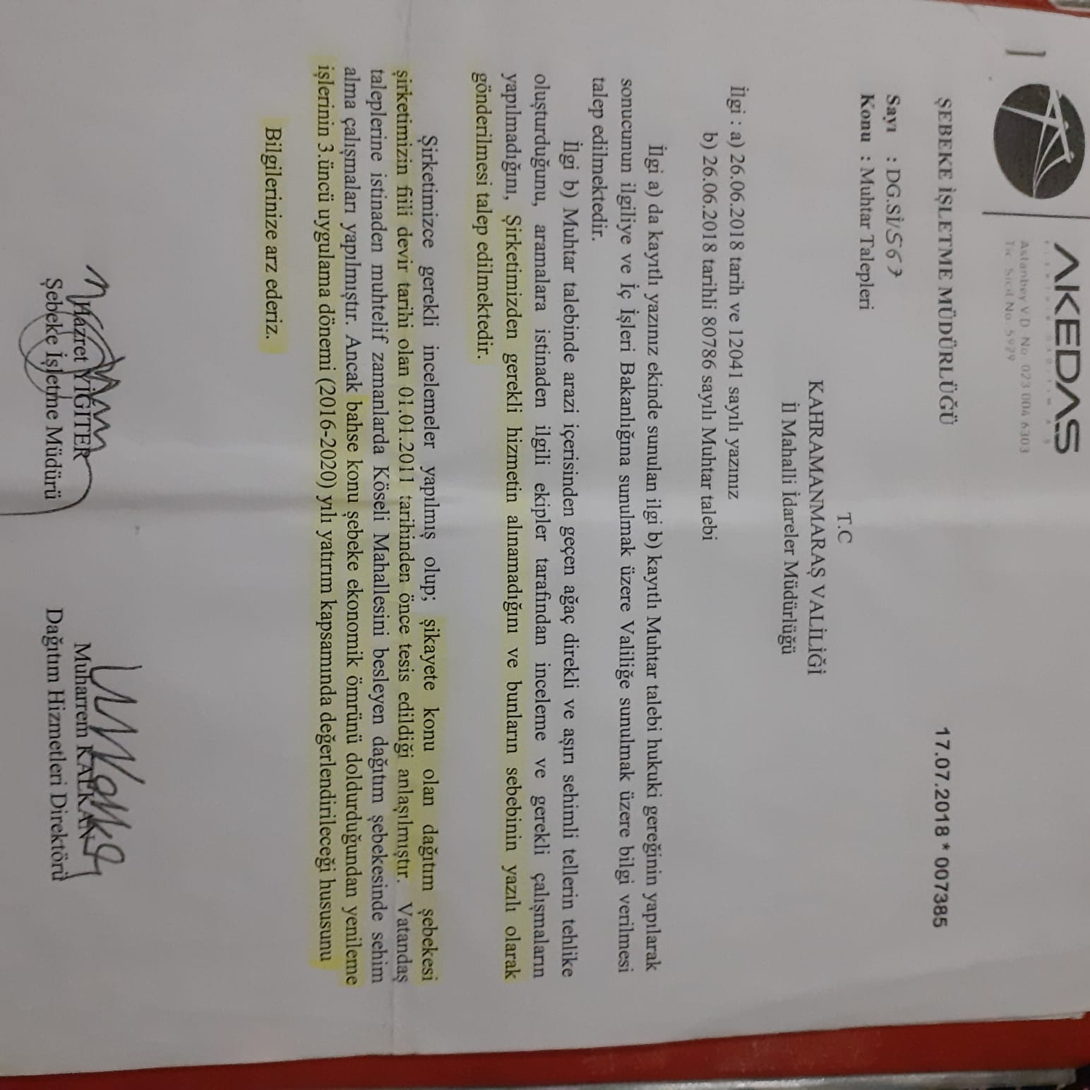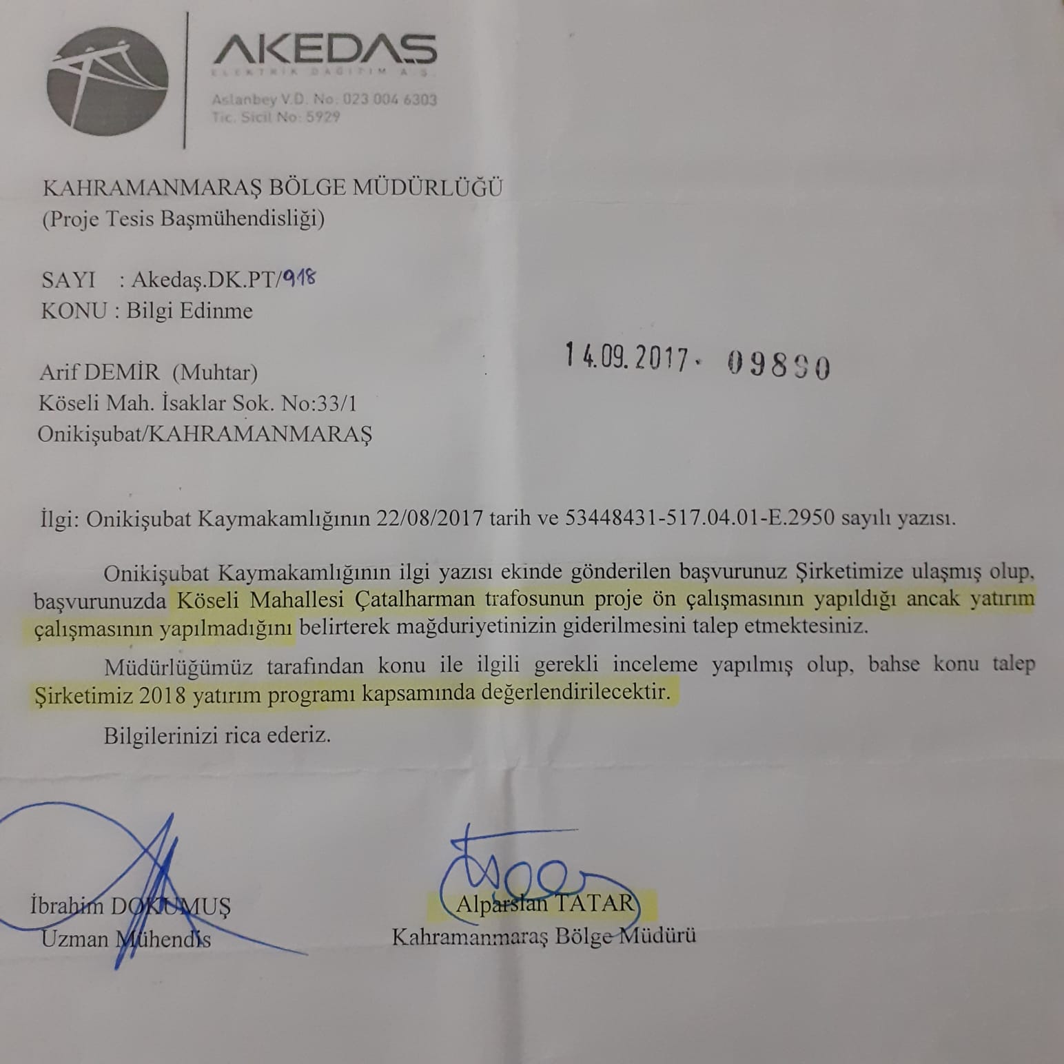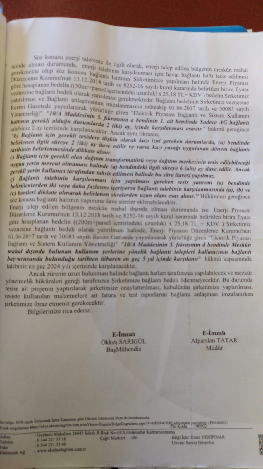Kahramanmaraş Kültür Turizm Sanat Spor Kalkınma Yardım Yardımlaşma ve Dayanışma Derneği (KARDER) Başkanı Ali Akkurt, Kahramanmaraş’ta elektriksiz kalan birçok yerleşim yeri ve tarımsal alanın bulunduğunu ve elektrik dağıtım şirketinin buralara elektrik götürmediğini belirtti.Akkurt, geçtiğimiz günlerde Kahramanmaraş’ta elektriksiz yerleşim yerinin kalmadığını duyuran elektrik dağıtım şirketi AKEDAŞ’a cevap verdi.Başkan Akkurt’un açıklaması şöyle:Milliyetçi Hareket Partisi (MHP) kahramanmaraş Milletvekili Prof. Dr. Sefer Aycan’ın kentteki ev ve işyerlerine elektrik bağlanması üzerine verdiği soru önergesine Enerji ve Tabii Kaynaklar Bakanlığı’ndan yanıt geldi. Bakanlıktan gelen cevapta; Kahramanmaraş’ta elektrik bağlanmayan herhangi bir yerleşim yerinin olmadığı bildirildi.MHP milletvekili Sayın Sefer Aycan’a verilen cevaptan Enerji Bakanlığı'nın Kahramanmaraş'tan haberi yok ya da araştırmadan ‘Kahramanmaraş'ta elektrik olmayan yer yoktur’ denilmiştir.Enerji Bakanlığı’ndan EPDK enerji mevzuatının aslı gibidir diye suret istedik. AKEDAŞ ile karşılaştırmak için bize verilen cevap AKEDAŞ’tan geldi. Neden Enerji Bakanlığı cevap yazmamış çözemedim.Bizim Enerji Bakanlığı’na yazdığımız dilekçeye AKEDAŞ Elektrik Dağıtım şirketinin cevap verme konusunda haklı bir gerekçesi var mı?Enerji Bakanlığına yazdığımız dilekçeye ek olarak Kahramanmaraş’ta AKEDAŞ’ın 2020 yılı yatırım planı ve EPDK mevzuatın aslını aslı gibidir belgesinin tarafımıza gönderilmesini talep ederek dilekçe göndermiştik. Ama dilekçemize cevaben Enerji Bakanlığı değil de AKEDAŞ cevap gönderiyor. EPDK mevzuatının aslını göndermiyorlar.Enerji Bakanlığı ve EPDK Başkanı Kahramanmaraş Kültür Sanat Spor Kalkınma Yardım Yardımlaşma ve Dayanışma Derneği dilekçelerini neden incelemeden direk ilgili kuruma göndererek hangi tür mevzuat dışına çıkan kanunları saklıyor?Mevzuat diyor ki:a) Meskun mahal içinde bulunan kullanım yerlerine yönelik bağlantı taleplerinin, bağlantı anlaşmasının imzalandığı tarihten itibaren;1) Sadece AG bağlantı hattının gerekli olduğu durumlarda 2 (iki) ay,2) Mevcut AG şebekesinde kapasite artışı veya ilave tesis yapılması gereken durumlar ile mevcut dağıtım transformatörü tesisinde güç artışı yapılması gereken durumlarda 4 (dört) ay,3) Yeni bir dağıtım transformatörü veya dağıtım merkezi yapılması gereken durumlarda 6 (altı) ay,4) Sadece OG bağlantı hattının gerekli olduğu durumlarda 4 (dört) ay,5) OG bağlantı hattı dışında, 2 (iki) km’ye kadar OG şebeke tesis edilmesi gereken durumlarda 6 (altı) ay,6) OG bağlantı hattı dışında, 2 (iki) km’den daha uzun OG şebeke tesis edilmesi gereken durumlarda 18 (on sekiz) ay içinde karşılanması esastır.b) Bağlantı için gerekli tesislere ilişkin olarak kazı izni gereken durumlarda, (a) bendinde belirlenen ilgili süreye 2 (iki) ay ilave edilir ve varsa kazı yasağı uygulanan dönem bağlantı tarihinin belirlenmesinde dikkate alınır.c) Bağlantı için gerekli olan dağıtım transformatörü veya dağıtım merkezinin tesis edilebileceği uygun yerin mevcut olmaması halinde (a) bendindeki ilgili süreye 6 (altı) ay ilave edilir. Ancak gerekli yerin kullanıcı tarafından tahsis edilmesi halinde bu süre ilavesi yapılmaz.ç) Bağlantı talebinin karşılanması için yapılması gereken tesis yatırımı (a) bendinde belirtilenlerden iki veya daha fazlasını içeriyorsa bağlantı talebinin karşılanmasında (a), (b) ve (c) bentleri dikkate alınarak belirlenen sürelerden uzun olanı esas alınır.d) Meskun mahal dışında bulunan kullanım yerlerine yönelik bağlantı talepleri kullanıcının bağlantı başvurusunda bulunduğu tarihten itibaren en geç 5 yıl içinde karşılanır.e) Başvuru sahibinin dağıtım sistemine bağlanmak istediği tarihin bu madde hükümlerine göre belirlenen tarihten daha sonra olması halinde bağlantı, başvuru sahibinin dağıtım sistemine bağlanmayı öngördüğü tarihe kadar yapılır.f) Meskun mahal içinde bulunan ve bağımsız bölüm bazında kurulu gücü 160 kW’a kadar olan tarımsal sulama haricindeki kullanım yerlerine ait bağlantı talepleri, başvuru sahibi tarafından müstakil OG bağlantısı tercih edilmediği müddetçe AG’den karşılanır.g) (f) bendi kapsamı dışındaki diğer durumlarda bağlantı yapılacak gerilim seviyesi mevcut şebeke koşulları ve planlamalara göre dağıtım şirketi tarafından belirlenir.ğ) AG dağıtım şebekesi bulunmayan mevcut yerleşim yerlerinin ilk kez yerleşime açılan genişleme alanları ile mevcut yerleşim yerleri dışında yeni oluşan mahallelerde bağlantı taleplerinin AG seviyesinden karşılanabilmesi için bir dağıtım transformatöründen beslenebilecek şekilde tarımsal sulama haricinde en az 5 kullanım yerine ilişkin bağlantı başvurusunun yapılmış olması gerekir.Bu mevzuat EPDK tarafından yayınlanmış.AKEDAŞ hangi mevzuat gereği olarak son 13 aylık dosyaları yatırım programına almayarak yatırım yapma hakkını 2025 olarak tutuyor?Şimdi soruyorum sayın vekilim Sefer Aycan’a sana verilen cevap, hangi raporlara göre ve hangi araştırma işlemlerine dayanarak hazırlandı?Pandemi döneminde olduğumuzdan dolayı toplantı yapamıyoruz. İnşallah bu Pandemi süreci bittiğinde EPDK, Enerji Bakanlığı, AK Parti, Cumhuriyet Halk Partisi, Milliyetçi Hareket Partisi, İYİ Parti, Gelecek Partisi, Yeniden Refah Partisi, Deva Partisi, Saadet Partisi ve Büyük Birlik Partisi il başkanları ile bir toplantı yapacağız. Kahramanmaraş'ta halen elektriksiz olan yerleşim yerleri ve tarımsal arazimiz var. Bu bölgelerdeki mağduriyetler giderilene kadar sesimizi gür çıkarmaya devam edeceğiz.
