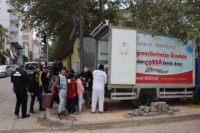PAZARCIK’TA SOĞUK KIŞ GÜNLERİNDE ÇOCUKLARIN İÇİ ÇORBAYLA ISINIYOR!Soğuk kış aylarının gelmesiyle birlikte çocukların için ısıtacak olan proje Başkan Bozdağ’ın talimatıyla başladı.Pazarcık Belediye her yıl olduğu gibi bu yılda kış günlerinde çocukların içini ısıtmaya devam ediyor. Soğuk kış aylarının gelmesiyle birlikte çocukların içini ısıtacak olan sıcak çorba ikramı Belediye ekiplerince İstiklal Ortaokulunda başladı.Bugün itibariyle ilk olarak İstiklal Ortaokulun da başlayan çorba ikramı her sabah farklı bir okulda devam edeceğini belirten Pazarcık Belediye Başkanı Yakup Hamdi Bozdağ; “Her yıl olduğu gibi bu yılda öğrencilerimize sıcak çorba ikramımıza başladık. Öğrencilerimizin sabah kalktıklarında kahvaltı yapma şansı olmayabilir. Poğaça, simit gibi sürekli katı yiyecekler tüketmemeleri, sıcak gıda almaları açısından bu uygulamayı başlatmıştık. Özellikle dar gelirli ailelerin çocuklarının kahvaltı yapabilme sıkıntıları da var. Dolayısıyla biz onlara sıcak çorba ikram ederek katkı sağlamak istedik. Bu kapsamda her öğrencilerimize “İçiniz Sıcak Zihniniz Açık Olsun” sloganıyla başlattığımız çorba ikramımız her gün düzenli olarak devam edecektir” dedi.
