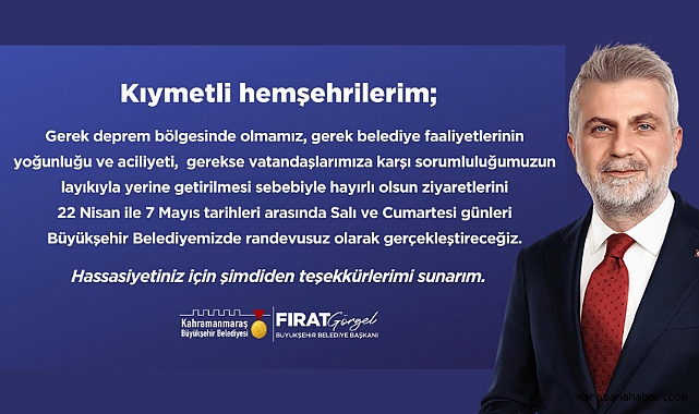 Kahramanmaraş Büyükşehir Belediye Başkanı Fırat Görgel, hayırlı olsun ziyaretinde bulunmak isteyen vatandaşlara yönelik sosyal medya hesabından bir çağrıda bulundu. Başkan Fırat Görgel paylaşımında: “Gerek deprem bölgesinde olmamız, gerek belediye faaliyetlerinin yoğunluğu ve aciliyeti, gerekse vatandaşlarımıza karşı sorumluluğumuzun layıkıyla yerine getirilmesi sebebiyle hayırlı olsun ziyaretlerini 22 Nisan ile 7 Mayıs tarihleri arasında Salı ve Cumartesi günleri Büyükşehir Belediyemizde randevusuz olarak gerçekleştireceğiz. Hassasiyetiniz için şimdiden teşekkürlerimi sunarım” ifadelerine yer verdi.