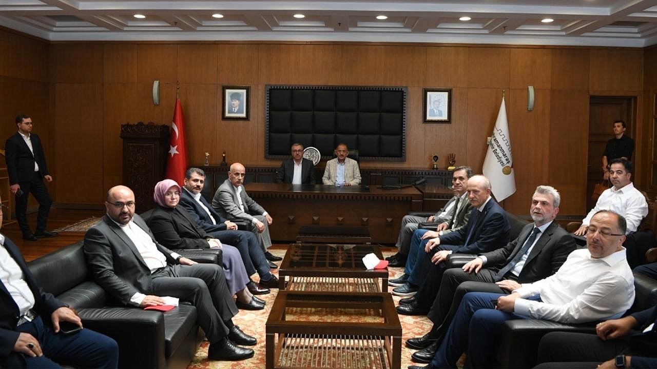 Kahramanmaraş Büyükşehir Belediye Başkanı Hayrettin Güngör, Kentsel Dönüşüm Toplu Temel Atma Töreni’ne katılmak ve bir dizi ziyarette bulunmak üzere şehre gelen Çevre, Şehircilik ve İklim Değişikliği Bakanı Mehmet Özhaseki’yi makamında ağırladı. TBMM Tarım, Orman ve Köyişleri Komisyonu Başkanı Prof. Dr. Vahit Kirişci, AK Parti Kahramanmaraş Milletvekilleri Ömer Oruç Bilal Debgici, Mevlüt Kurt, Dr. Tuba Köksal ve Prof. Dr. Mehmet Şahin, AK Parti İl Başkanı Fırat Görgel, ilçe belediye başkanları, Galatasaray Spor Kulübü Başkanı Dursun Özbek ve kurum yetkililerinin de yer aldığı programda Başkan Hayrettin Güngör, Bakan Özhaseki ve beraberindeki heyete şehirde yürütülen çalışmalara ilişkin son bilgileri aktardı.
