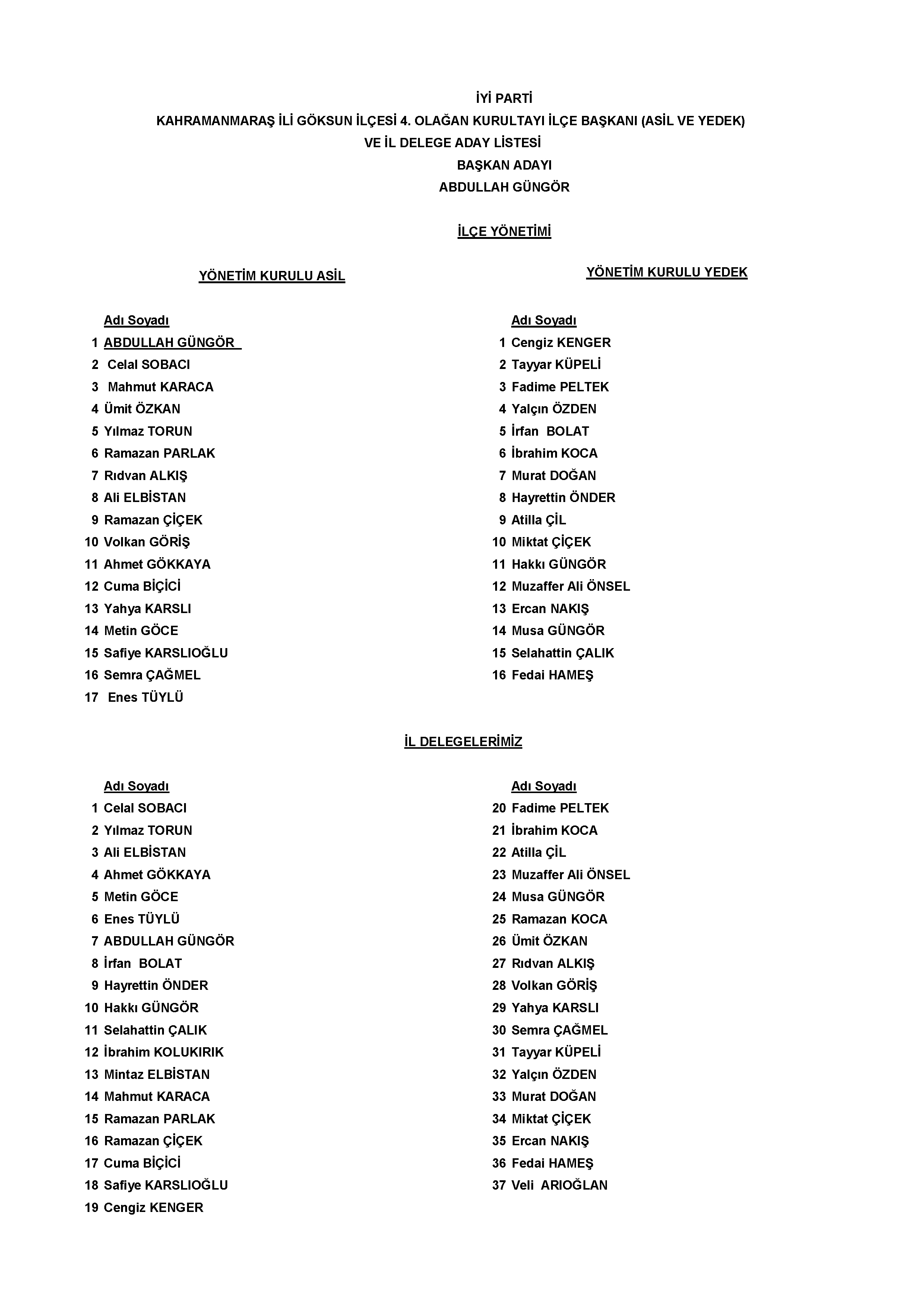 İYİ Parti Göksun 4. Olağan Genel Kurulu bugün Cumhuriyet Meydanı’ndaki parti binasında gerçekleşti. Tek adayla gidilen genel kurulda mevcut Başkan Abdullah Güngör, güven tazeleyerek yeniden başkan seçildi.