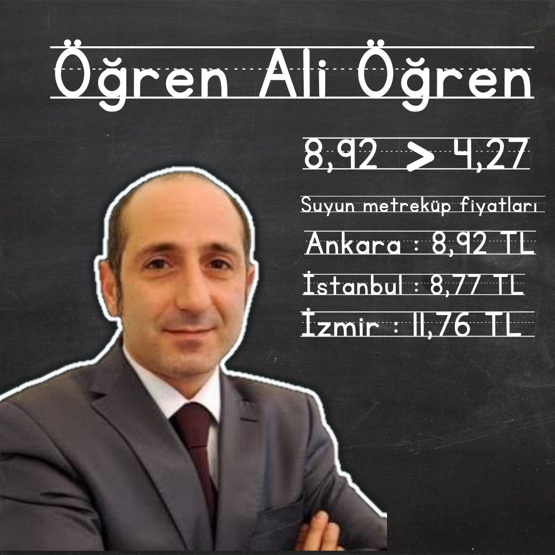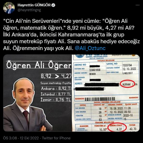 Büyükşehir Belediye Başkanı Hayrettin Güngör’ün su metreküp fiyatlarına ilişkin güncel rakamları da paylaştığı mesajında, “Cin Ali'nin Serüvenleri"nde yeni cümle: ‘Öğren Ali öğren, matematik öğren!’ 8,92 mi büyük, 4,27 mi Ali? İlki Ankara'da, ikincisi Kahramanmaraş'ta ilk grup suyun metreküp fiyatı Ali. Sana abaküs hediye edeceğiz Ali. Öğrenmenin yaşı yok Ali” ifadeleri yer aldı.