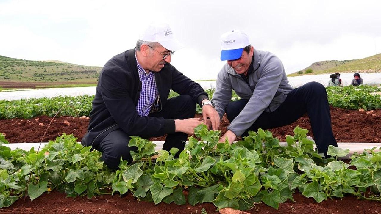 Kahramanmaraş Büyükşehir Belediye Başkanı Hayrettin Güngör, Tarım ve Orman Bakanı Prof. Dr. Vahit Kirişci ile şehrin en önemli tarımsal üretim merkezlerinden Türkoğlu ilçesi Kadıoğluçiftliği Mahallesi’ni ziyaret ederek çiftçi ve tarım işçileriyle bir araya geldi. Türkoğlu Belediye Başkanı Osman Okumuş, AK Parti İl Başkanı Fırat Görgel ve teşkilat mensuplarının da yer aldığı ziyarette, salatalık hasadı yapan işçilerle buluşan Bakan Kirişci ve Başkan Güngör, çalışanlarla sohbet etti ve taleplerini dinledi. Kadıoğluçiftliği’nde çiftçilerin katılımıyla düzenlenen istişare ve değerlendirme toplantısında Bakan Kirişci, şehirde tarım alanında hayata geçirilen ve planlanan projelere ilişkin katılımcılara bilgiler aktardı.