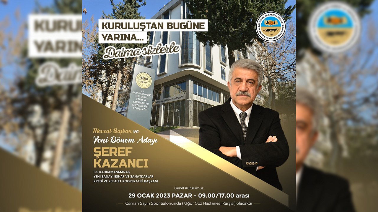 Yıllardır bu emanete nasıl sahip çıkıp, güveni ve hizmet bayrağını tüm ekibimizle birlikte tesis etmenin huzurunu yaşadıysak ayni kararlılıklahizmet etmeye devam edeceğimizden de kimsenin endişesi olmasın.SS Kahramanmaraş Yeni Sanayi Esnaf ve Sanatkarlar Kredi Kefalet Kooperatifi büyük bir ailedir, bu ailenin her bireyi burada en üst düzey hizmet görmüştür, sorunlarına çare bulunmuştur.Kimileri işini büyütmüş, kimileri araç almış, kimileri bina almış, kimileri çeşitli yatırım yaparak evlerine ekmek götürmüştür. Hepsinin ayrı ayrı bir başarı hikâyesi vardır, bu başarının bir parçası olmak ise en büyük övünç kaynağımızdır.