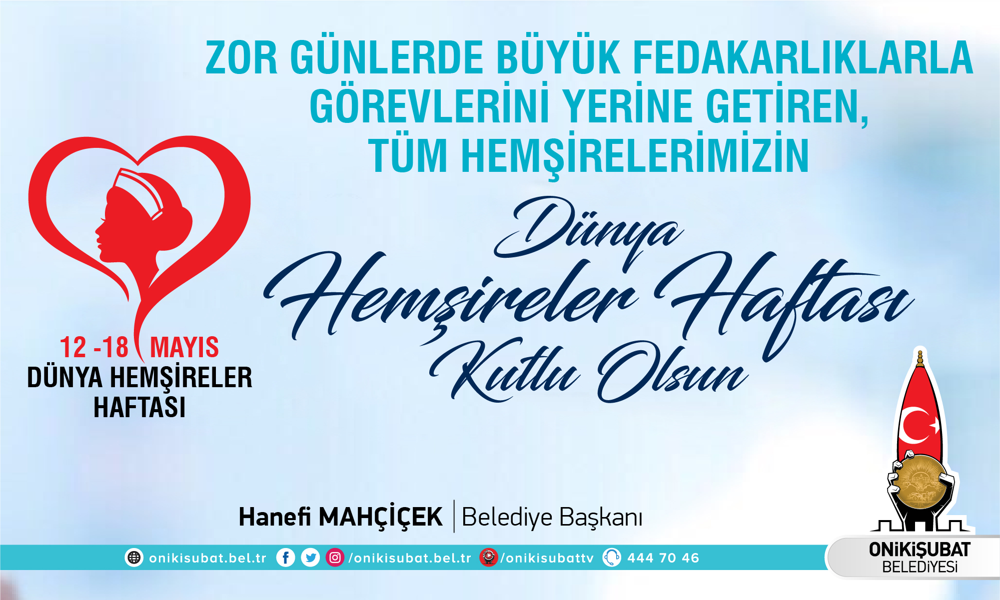 Onikişubat Belediye Başkanı Hanefi Mahçiçek,12-18 Mayıs Hemşirelik Haftası dolayısıyla mesaj yayımladı. Mesajında hemşireliğin geçmişten günümüze çok önemli aşamalar kaydederek, sağlık sisteminin vazgeçilmez bir unsuru haline geldiğine vurgu yapan Başkan Mahçiçek, modern hemşireliğin kurucusu FlorenceNightingale’in doğum gününde kutlanan 12 Mayıs Hemşireler Günü’nün dünyada 1954 yılından bu yana, ülkemizde ise 1964 yılında kutlanmaya başlandığını ifade etti.
