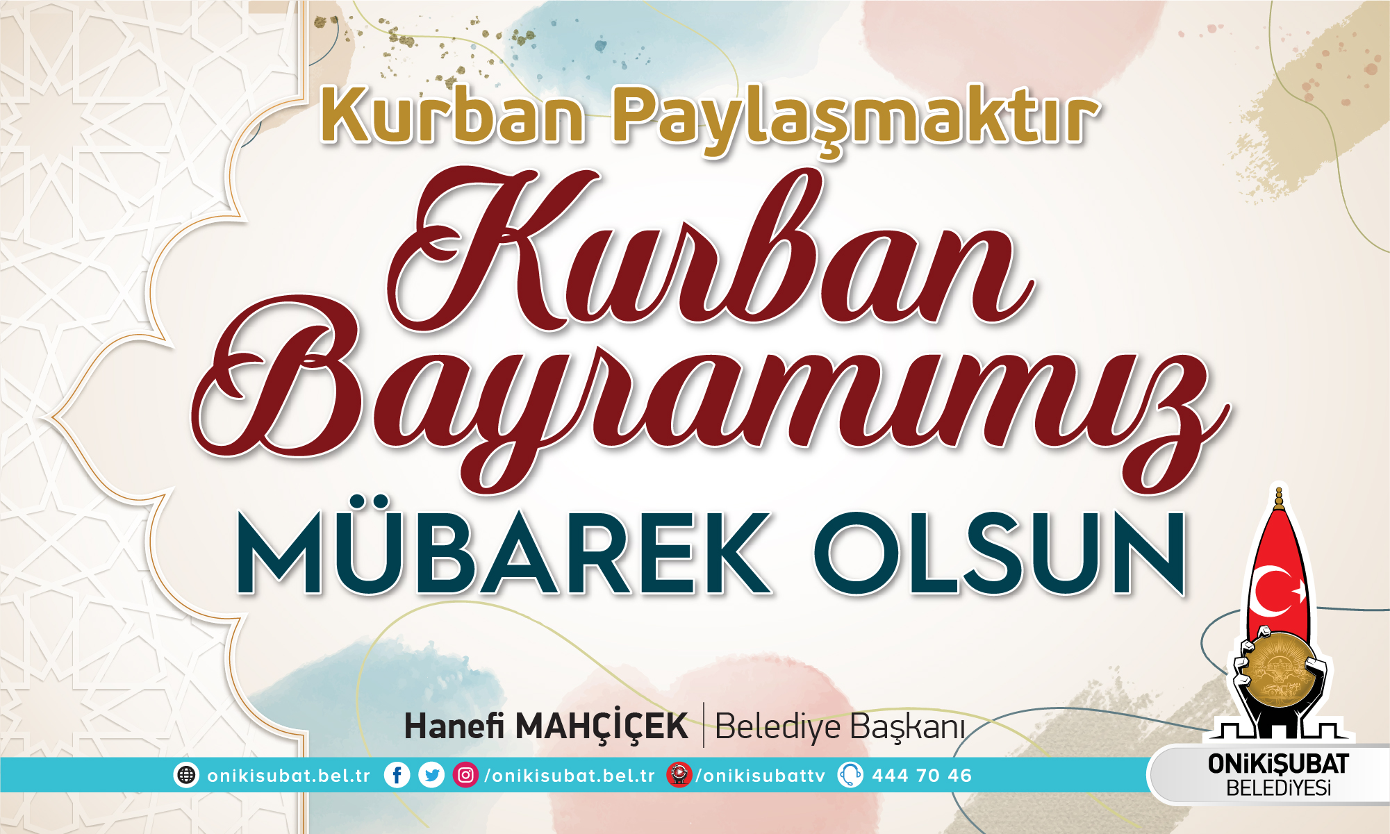 Onikişubat Belediye Başkanı Hanefi Mahçiçek, yayımladığı mesajda, “Kurban Bayramı; barışın, esenliğin, yakarışın, statülerden arınarak eşitlenmenin, tefekkürün, sabrın, nefisleri terbiye etmenin, yoksula, kimsesize ve çaresize yakınlaşarak, paylaşmanın bayramıdır. Bu nedenle ‘Kurban Paylaşmaktır’ diyorum ve başta Kahramanmaraşlı kardeşlerim olmak üzere, bütün İslam âleminin Kurban Bayramını tebrik ediyorum” ifadelerini kullandı.