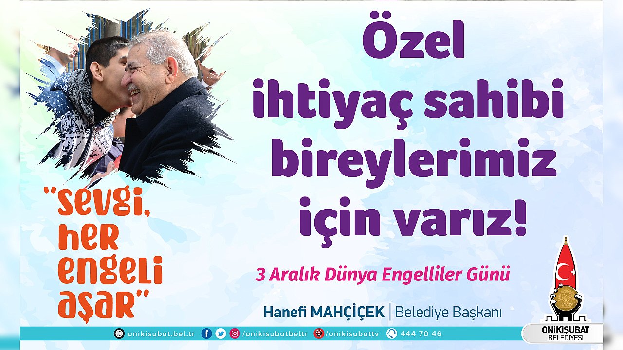 Onikişubat Belediye Başkanı Hanefi Mahçiçek,3 Aralık Dünya Engelliler Günü dolayısıyla mesaj yayımladı. Mesajında, Onikişubat Belediyesi olarak özel ihtiyaç sahibi bireylerin hayatlarını kolaylaştırma ve sosyal hayata katılımlarını artırma adına önemli çalışmalara imza attıklarını belirten Başkan Mahçiçek, ilçeyi inşa ve ihya ederken engelleri ortadan kaldırmaya gayret ettiklerini vurguladı.