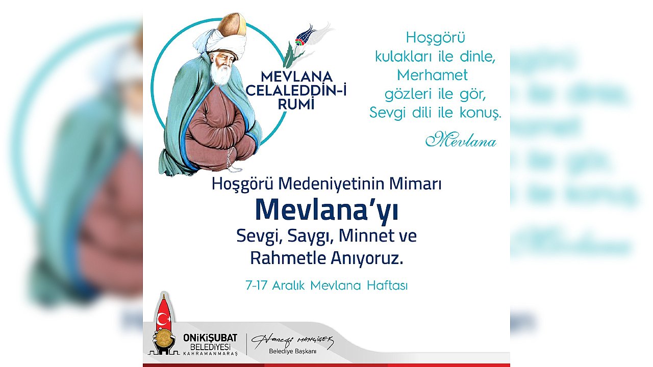 Mevlânâ Celâleddîn-i Rûmî’nin 749’ncı vuslat yıl dönümü dolayısıyla mesaj yayımlayan Onikişubat Belediye Başkanı Hanefi Mahçiçek, Anadolu insanının gönül zenginliğinin, hoşgörüsünün ve samimiyetinin vücut bulmuş hali olan Mevlana’nın, bugün de aşkla, sevgiyle, dostlukla, teslimiyetle birlikte mücadelenin, umudun, cesaretin ve özgüvenin en önemli sembollerinden biri olduğunu belirtti.