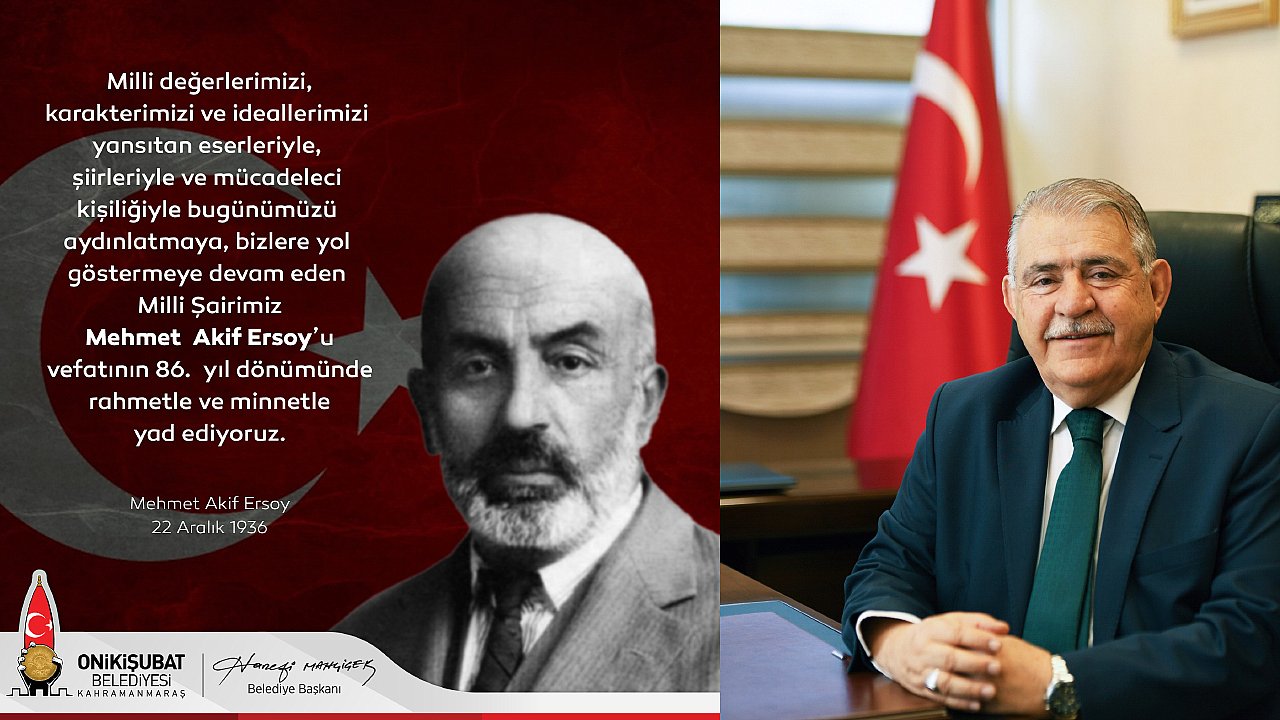 “Sözlerimin başında, milli değerlerimizi, karakterimizi ve ideallerimizi yansıtan eserleriyle, şiirleriyle ve mücadeleci kişiliğiyle bugünümüzü aydınlatmaya, bizlere yol göstermeye devam eden Mehmet Akif Ersoy’u vefat yıl dönümünde rahmet ve minnetle yad ediyorum. İstiklal ve istikbal mücadelemizin en çetin geçtiği dönemlerinde bağımsızlık fikrini İslam coğrafyasına deklare eden Mehmet Akif Ersoy, dünyadaki tüm Müslümanların kalplerinin bir ve beraber atması için mücadele vermiştir. Coşkulu, heyecanlı ve daima umutlu kişiliğiyle milletimize öncülük eden istiklal şairimiz, çıkardığı dergiler, yazıları, kürsü konuşmalarıyla bir düşüncenin, inancın, idealin taşıyıcısı olmuş; şiirleri ve İstiklal Marşı ile bu misyonu en veciz ifadelerle dile getirmiştir.Kadim Kahramanmaraş’ımızın kurtuluş mücadelesinde olduğu gibi tarihinin her döneminde bağımsızlığına ve vatanına yönelen tehditlere birlik ve beraberliğinden ödün vermeden karşı koyan ecdadımızın torunları olan bizler, inanıyorum ki Akif’in İstiklal Marşı ile ortaya koyduğu değerlerimize her zaman sahip çıkacak; ortak sesimiz, ortak vicdanımız olan İstiklal Marşı’mızı ilelebet muhafaza edeceğiz. Milletimizin gönlünde müstesna bir yere sahip olan vatan şairimiz Mehmet Akif Ersoy, başta İstiklal Marşı’mız olmak üzere eserleriyle ve fikirleriyle her zaman saygıyla yâd edilecektir. Bu anlamda biz de Onikişubat Belediyesi olarak Mehmet Akif’in fikirleri yaşatmak ve gençlerimize aktarmak adına Safahat başta olmak üzere çeşitli kitaplarını şehrimizdeki büyük bir özveriyle öğrencilerimize ulaştırıyoruz. Şiirini; imanı, düşüncesi ve milletinin hizmetine adayan, bağımsızlık mücadelemizin simgesi İstiklal Marşı’mızın yazarı milli şairimiz Mehmet Akif Ersoy’u, ebedi aleme irtihalinin86’ncı yıl dönümünde Milli Şairimiz Mehmet Akif Ersoy’u hürmet, rahmet ve minnetle yad ediyor, vatandaşlarımızı en kalbi duygularımla selamlıyorum.”