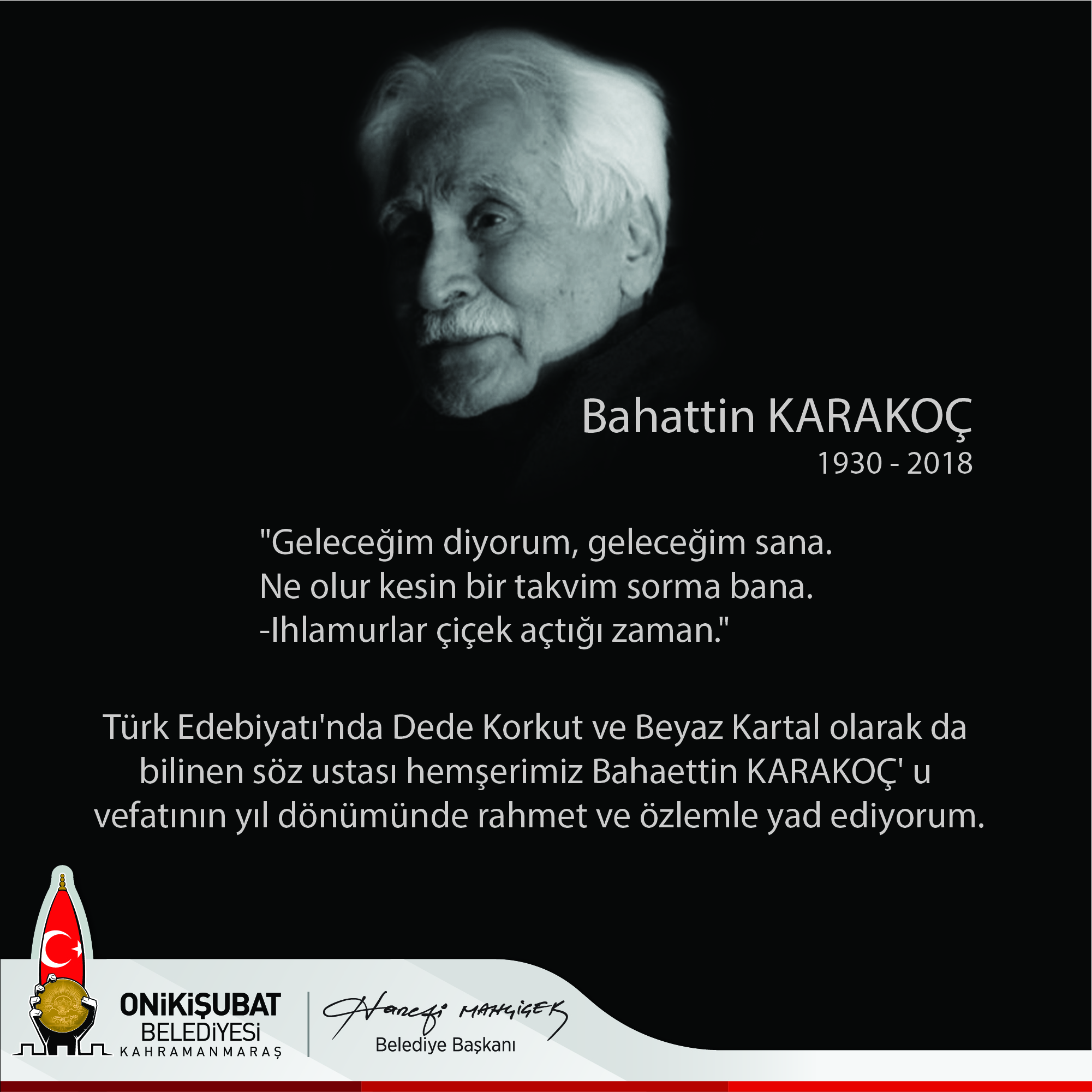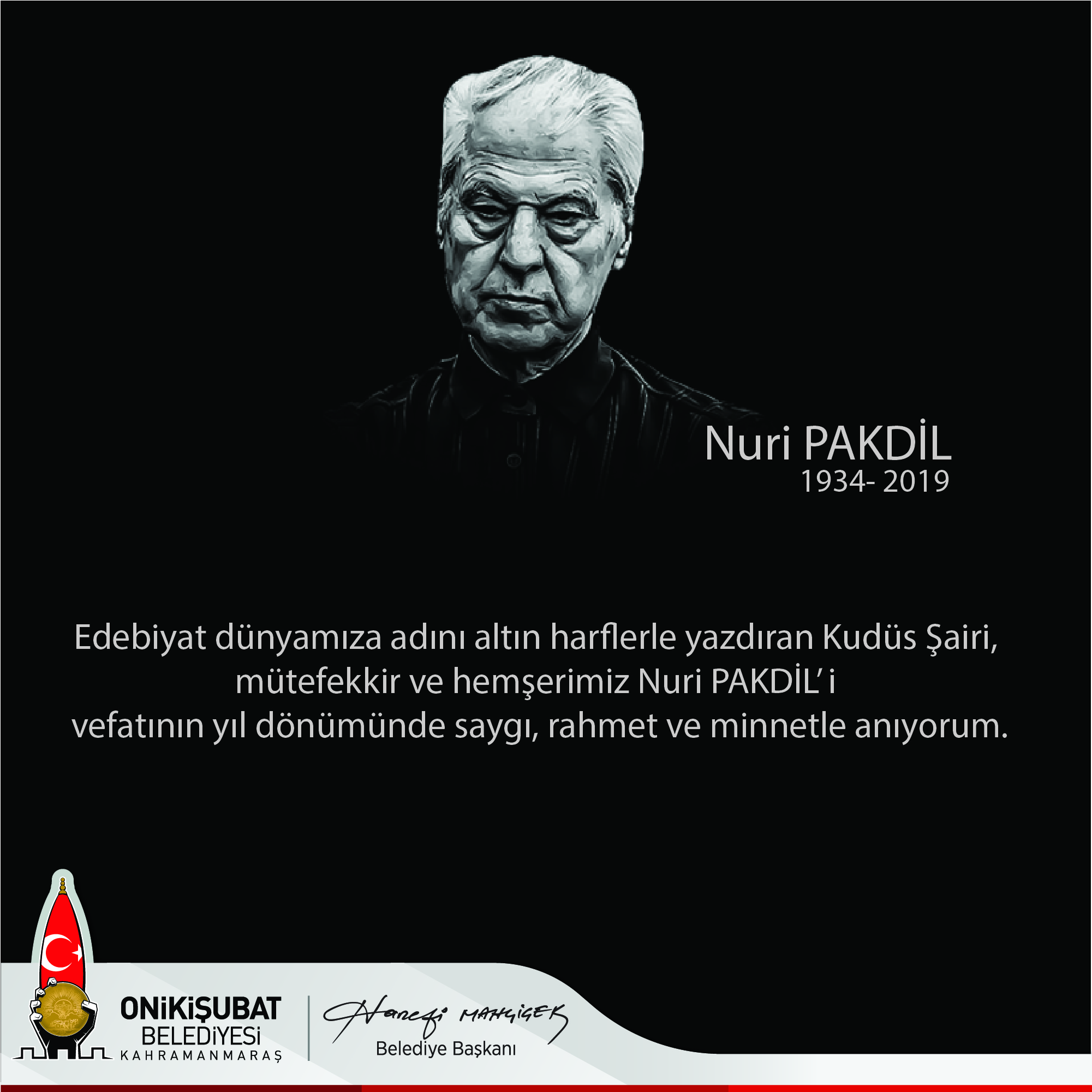 “Edebiyat dünyamıza zenginlik katan her şair ve yazarın kendine özgü bir şehir algısı vardır. Şairler ve yazarlar, doğup büyüdükleri, çocukluklarının, ilkgençlik yıllarının geçtiği şehirlere daha bir tutkuyla bağlıdır. Bu yüzden şehirleri, o şehrin çocukları olan usta yazarlardan okumak çok önemlidir. İşte bu anlamda Kahramanmaraş’ımızın, şiirin, şairin ve edebiyatın başkenti olmasında birçok önemli ismin payı vardır. Kahramanmaraş’tan doğarak Türk Edebiyatı’na mal olan, şehrimize geniş bir anlam derinliği yaratan isimlerin başında ‘7 Güzel Adam’ımızdan Kudüs Şairi Sayın Nuri Pakdil ile ‘Dede Korkut’ ve ‘Beyaz Kartal’ lakaplı şair ve yazar Bahaettin Karakoç gelmektedir. Bugün ise edebiyatımızın en değerli şahsiyetlerinden ikisi olan Nuri Pakdil ve Bahaettin Karakoç’un vefat yıl dönümüdür. 17 Ekim 2018’de Bahaettin Karakoç, bir yıl sonra 18 Ekim’de ise Nuri Pakdil’in vefat etmeleriyle derinden üzülmüştük. İnanıyorum ki her iki şahsiyetimiz de gerek eserleri gerekse gönül dünyamızda bıraktığı izlerle yüzlerce yıl unutulmayacaklardır. Eksikliklerini sık sık hissettiğimiz Edebiyatımızın ve kültür dünyamızın unutulmayacak isimlerinden hemşerilerimiz Nuri Pakdil ve Bahaettin Karakoç’u vefatlarının yıl dönümünde rahmetle ve hürmetle yâd ediyorum.”
