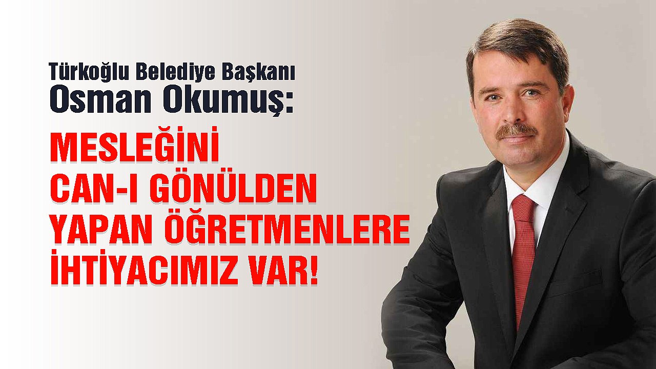 Öğretmenlerin icra ettikleri mesleğin önemine vurgu yapan Okumuş, şunları kaydetti: “Ailemizin, memleketimizin ve ülkemizin geleceğini emanet ettiğimiz çocuklarımızı çağın gereksinimlerini karşılayacak şekilde bilgili, donanımlı, açık fikirli, heyecanlı ve üretken bireyler olarak yetiştirmek için canla başla çalışan öğretmenlerimize can-ı gönülden teşekkür ediyorum. Hem Belediye Başkanı hem de bir ‘Öğretmen’ olarak güzel ilçemiz Türkoğlu başta olmak üzere; yurdumuzun her köşesinde görevlerini özveriyle yerine getiren tüm öğretmenlerimizin 24 Kasım Öğretmenler Günü’nü yürekten kutluyorum. Yıllarını bu mesleğe adamış emekli öğretmenlerimize sağlık, huzur ve esenlikler temenni ediyor, ebediyete intikal eden değerli öğretmenlerimizi de saygı ve rahmetle anıyorum.”