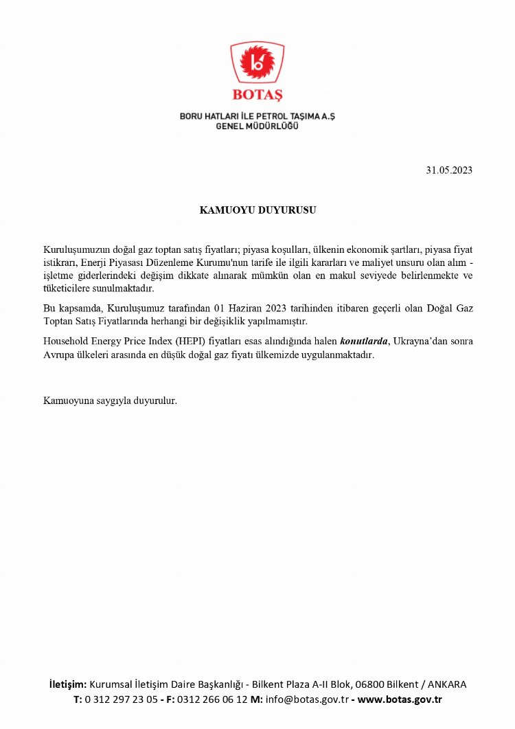 BOTAŞ, 1 Haziran 2023 itibariyle geçerli olan doğal gaz toptan satış fiyatlarında herhangi bir değişiklik yapılmadığını duyurdu. ANKARA (İGFA) - Kısa adı BOTAŞ olan Boru Hatları ile Petrol Taşıma A.Ş 1 Haziran itibariyle geçerli olacak tarifeye ilişkin açıklama yaptı. Sosyal medya hesabından yapılan açıklamada, bugünden itibaren doğal gazda herhangi bir zam olmayacağı belirtildi. BOTAŞ açıklamasında, "Kuruluşumuzun doğal gaz toptan satış fiyatları; piyasa koşulları, ülkenin ekonomik şartları, piyasa fiyat istikrarı, Enerji Piyasası Düzenleme Kurumu'nun tarife ile ilgili kararları ve maliyet unsuru olan alım - işletme giderlerindeki değişim dikkate alınarak mümkün olan en makul seviyede belirlenmekte ve tüketicilere sunulmaktadır. Bu kapsamda, Kuruluşumuz tarafından 1 Haziran 2023 tarihinden itibaren geçerli olan Doğal Gaz Toptan Satış Fiyatlarında herhangi bir değişiklik yapılmamıştır. Household Energy Price Index (HEPI) fiyatlan esas alındığında halen konutlarda, Ukrayna'dan sonra Avrupa ülkeleri arasında en düşük doğal gaz fiyatı ülkemizde uygulanmaktadır. Kamuoyuna saygıyla duyurulur" ifadeleri yer aldı.