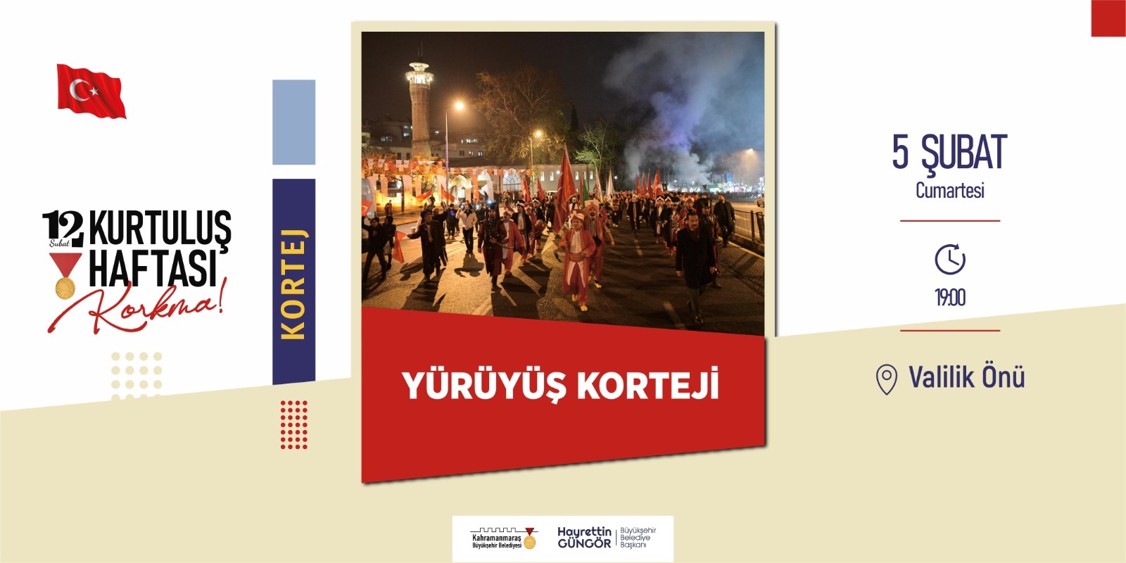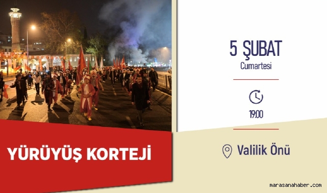 5 Şubat Cumartesi (bugün) gerçekleştirilecek etkinliklerden biri de ‘Maraş Milli Mücadelesi ve Şehrimize Kahramanlık Unvanı Verilişi’ konferansı olacak. Necip Fazıl Kısakürek Kültür Merkezi’nde 20.00’da başlayacak etkinlikte Prof. Dr. Orhan Doğan, Doç. Dr. Mustafa Edip Çelik ve Doç. Dr. Erhan Alparslan, Kahramanmaraş’ın milli mücadelesini anlatacak. Büyükşehir Belediyesi’nden yapılan açıklamada, yürüyüş kortejinin ardından gerçekleştirilecek etkinliğe tüm vatandaşların davetli olduğu belirtildi.