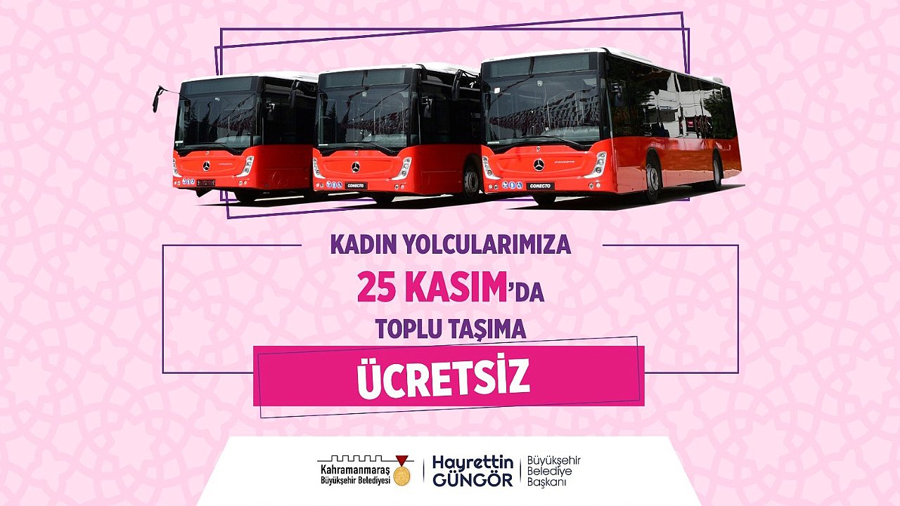 Kahramanmaraş Büyükşehir Belediyesi, sosyal belediyecilik hizmetleri çerçevesinde 25 Kasım Kadına Yönelik Şiddete Karşı Uluslararası Mücadele Günü dolayısıyla anlamlı bir çalışmayı daha hayata geçiriyor. Bu kapsamda, 25 Kasım Cuma günü şehir genelinde Büyükşehir Belediyesi ve Özel Halk Otobüsleri gün boyunca kadınlara ücretsiz ulaşım hizmeti verecek.Kadınlara ücretsiz toplu taşıma uygulamasını sosyal medya hesabından açıklayan Büyükşehir Belediye Başkanı Hayrettin Güngör, “25 Kasım Kadına Yönelik Şiddete Karşı Uluslararası Mücadele Günü’nde farkındalık oluşturma hedefiyle ekiplerimiz bir çalışma yaptı. 25 Kasım’da Büyükşehir ve Özel Halk Otobüslerimiz kadın yolcularımızı ücretsiz taşıyacak. Tüm yolcular biniş kartlarını okuttuklarında “Kadına Şiddete Hayır” anonsuyla karşılanacak. Her türlü şiddetin karşısında kadınların yanındayız” ifadelerini kullandı.
