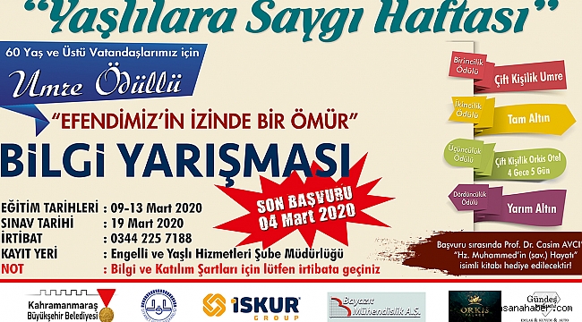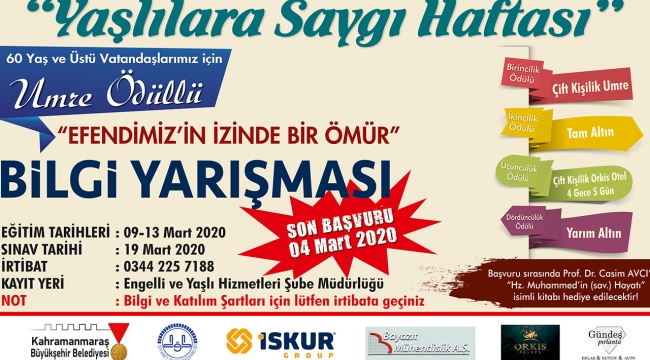 Kahramanmaraş Büyükşehir Belediyesi’nin Yaşlılara Saygı Haftası dolayısıyla gerçekleştireceği “Efendimiz’in İzinde Bir Ömür” konulu bilgi yarışmasının tarihleri belli oldu. Yarışmaya yalnızca 60 yaş ve üstündeki kişiler katılabilmektedir. Yarışma için önce 09-13 Mart 2020 tarihleri arasında eğitim verilecektir. Eğitimden sonra, 19 Mart 2020 tarihinde sınav yapılacaktır. Eğitime katılmak isteyenler için son başvuru tarihi ise, 04 Mart 2020’dir. Birincilik ödülü, çift kişilik umre; ikincilik ödülü, tam altın; üçüncülük ödülü, Orkis Otel’de 4 gece 5 gün çift kişilik tatil; dördüncülük ödülü yarım altın olan “Efendimiz’in İzinde Bir Ömür” Bilgi Yarışmasına başvurular, kahramanmaraş Büyükşehir Belediyesi Engelli ve Yaşlı Hizmetleri Şube Müdürlüğüne yapılacaktır. Yarışma şartlarıyla ilgili ayrıntılı bilgi almak isteyenler için irtibat numarası: 0344 225 7188. Ayrıca başvuruda bulunan herkese Prof. Dr. Casim Avcı’nın “Hz. Muhammed’in (sav.) Hayatı” isimli kitabı hediye edilecektir.