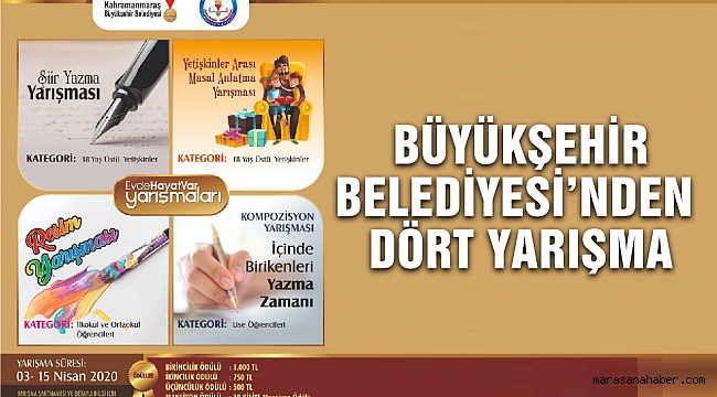 Kahramanmaraş Büyükşehir Belediyesi korona virüs salgını kapsamında #evdehayatvar uygulamasını neşeli hale getirmek için dört ayrı yarışma düzenliyor.Kahramanmaraş Büyükşehir Belediyesi #evdehayatvar temalı dört ayrı yarışma düzenliyor.Kahramanmaraş Büyükşehir Belediyesi web sitesinden yapılan duyuruda: “İçinde yaşadığımız bu zorlu süreçte evlerimizde çocuklarımızla hep bir arada, hoşça vakit geçirerek ‘evdekal’maya yardımcı olması düşüncesiyle yarışmalar düzenlenmiştir. Yarışmaların ana teması “EvdeHayatVar” olarak belirlenmiştir. Yarışmalar, 03-15 Nisan 2020 tarihleri arasında düzenlenmiş olup, sonuçlar 20 Nisan 2020’de ilan edilecektir.Yarışma şartnameleri ve başvuru formuna aşağıdaki bağlantılardan ulaşabilirsiniz” denilerek bilgi verildi.Yarışmalar; İlkokul, Ortaokul, Liseler ve yetişkinler arasında olup, katılmak isteyenler; https://kahramanmaras.bel.tr/node/11671 web adresinden gerekli bilgi ve belgelere ulaşabilirler.