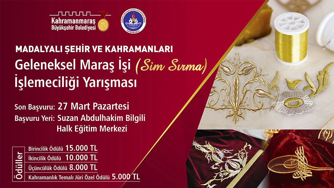 Büyükşehir Belediyesi ile Suzan ve Abdulhakim Bilgili Halk Eğitimi Merkezi iş birliğiyle düzenlenen Geleneksel Maraş İşi (Sim Sırma) İşlemeciliği yarışmasında dereceye girenler çeşitli ödüller de kazanabilecek. Yarışmanın birincilik ödülü 15 bin TL. İkinci olan yarışmacı 10 bin, üçüncü ise 8 bin TL para ödülü almaya hak kazanacak. Jüri özel ödülü ise 5 bin TL. Büyükşehir Belediyesi’nden yapılan açıklamada, yarışmaya ve başvuru şartlarına ilişkin detaylı bilgiye https://kahramanmaras.bel.tr/duyuru/2023/02/02/geleneksel-maras-isi-sim-sirma-islemeciligi-yarismasi adresi üzerinden ulaşılabileceği belirtildi.