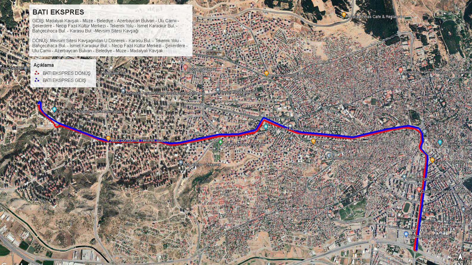B/75 Batı Ekspres Madalyalı Kavşak- Mevsim Sitesi hattı ise gidişte; Madalyalı Kavşak – Müze – Büyükşehir Belediyesi – Azerbaycan Bulvarı – Ulu Camii – Şekerdere – NFK Kültür Merkezi – Tekerek yolu – İsmet Karaokur Bulvarı – Bahçeci Hoca Bulvarı – Karasu Bulvarı – Mevsim Sitesi Kavşağı istikametlerini kullanırken, dönüşte; Mevsim Sitesi Kavşağı – Karasu Bulvarı – Bahçeci Hoca Bulvarı – İsmet Karaokur Bulvarı – NFK Kültür Merkezi – Şekerdere – Ulu Camii – Azerbaycan Bulvarı – Büyükşehir Belediyesi karşısı – Müze – Madalyalı Kavşak güzergâhını kullanacak.
