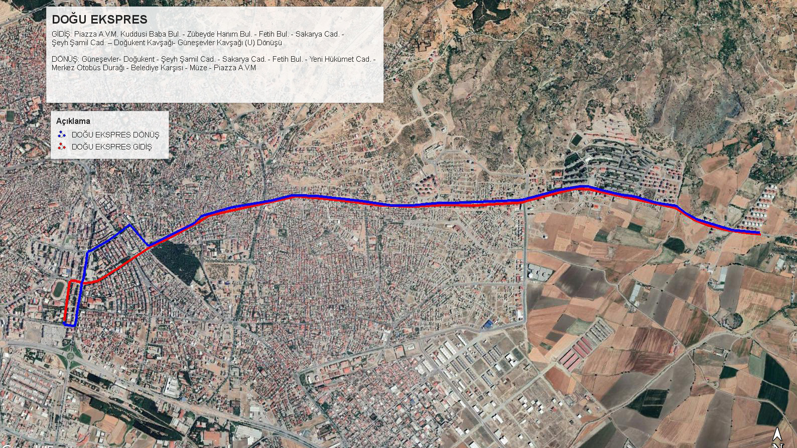 B/74 Doğu Ekspres Piazza AVM – Güneşevlerhattı gidişte;Piazza AVM – Kuddusi Baba Bulvarı – Zübeyde Hanım Bulvarı – Fetih Bulvarı – Sakarya Caddesi – Şeyh Adil Caddesi – Doğukent Kavşağı – Güneşevler Kavşağı istikametlerini kullanırken, dönüşte;Güneşevler Kavşağı – Doğukent Kavşağı – Şeyh Adil Caddesi – Sakarya Caddesi – Fetih Bulvarı – Yeni Hükümet Caddesi – Merkez Otobüs Durağı – Büyükşehir Belediyesi karşısı – Müze – Piazza AVM güzergâhını kullanacak.
