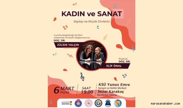 Kahramanmaraş Büyükşehir Belediyesi ve Sütçü İmam Üniversitesi iş birliğiyle Dünya Kadınlar Günü dolayısıyla düzenlenen etkinlikler hız kesmeden sürüyor. Alanında uzman konuklar, kadını merkeze alan çeşitli konularla Kahramanmaraşlılarla buluşuyor. Etkinlik takvimi kapsamında, 6 Mart Pazar günü (yarın) ‘Kadın ve Sanat’ adlı söyleşi ve müzik dinletisi sanatseverlerle buluşacak. KSÜ Yunus Emre Kongre ve Kültür Merkezi Sezai Karakoç Konferans Salonu’nda saat 19.00’da başlayacak etkinliğin konukları Cumhurbaşkanlığı Senfoni Orkestrası İlk Kadın Başkemancısı Doç. Dr. Jülide Yalçın ve Piyanist Doç. Dr. elif Önal olacak.