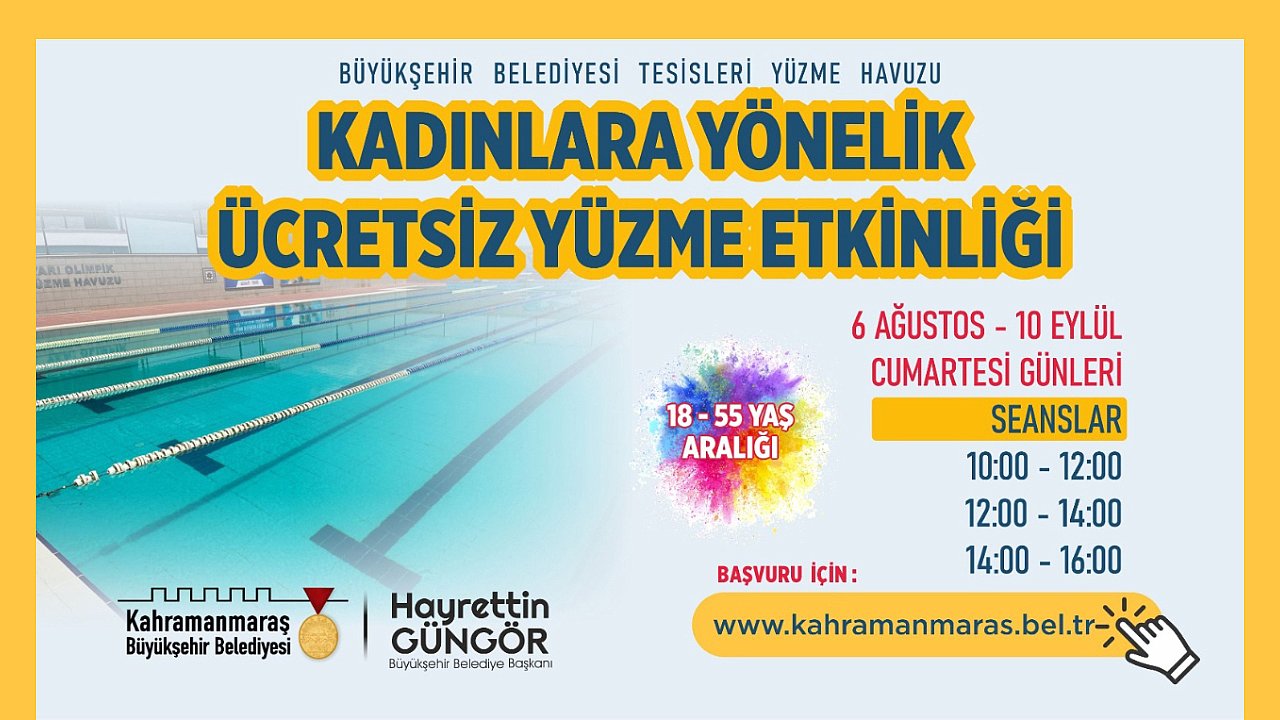 İnsan odaklı sosyal belediyecilik hizmetleri kapsamında şehirde çeşitli etkinlikler gerçekleştiren Kahramanmaraş Büyükşehir Belediyesi, kadınlara yönelik bir projeyi daha hayata geçiriyor. Bu kapsamda, 18 – 55 yaş aralığındaki kadınlara yönelik yüzme etkinliği gerçekleştirilecek. 6 Ağustos – 10 Eylül tarihleri arasında Cumartesi günleri düzenlenecek etkinlikler 10.00 – 12.00, 12.00 – 14.00 ve 14.00 – 16.00 saatleri arasında üç seans olarak katılımcılarla buluşacak. Ücretsiz olarak gerçekleştirilecek etkinlikte katılımcılara bone de hediye edilecek. Büyükşehir Belediyesi Tesisleri Yüzme Havuzu’nda sınırlı sayıda katılımcıyla gerçekleştirilecek etkinliğine https://kahramanmaras.bel.tr/form/bayanlara-yonelik-yuzme-etkinligi-basvuru-formu internet adresi üzerinden başvuru yapılabiliyor. Büyükşehir Belediyesi’nden yapılan açıklamada, yüzme etkinliğine ilişkin detaylı bilgiye 0553 041 53 53 numaralı WhatsApp danışma hattı üzerinden ulaşılabileceği belirtildi.