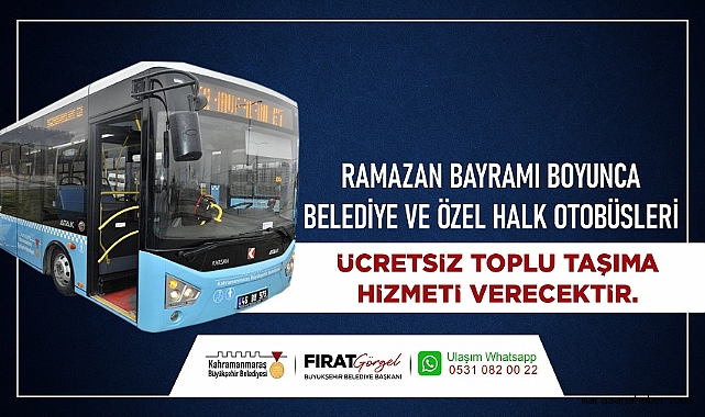 Sosyal belediyecilik çerçevesinde faaliyetlerini sürdüren ve daima vatandaşın yanında olan Kahramanmaraş Büyükşehir Belediyesi, Ramazan Bayramı boyunca belediye ve özel halk otobüslerinin ücretsiz toplu taşıma hizmeti vereceğini duyurdu. Ramazan Bayramı’nın ilk günü olan 10 Nisan Çarşamba günü başlayacak uygulama 12 Nisan Cuma günü saat 23.59’a kadar devam edecek. Ücretsiz toplu taşıma hizmeti şehir merkezinin yanı sıra Afşin, Elbistan ve Göksun ilçeleri ile Ayvalı’da da geçerli olacak. Yapılan açıklamada; Ramazan Bayramı’nda hizmet verecek toplu taşıma araçlarının güzergâh ve hareket saatlerine https://kahramanmaras.bel.tr/toplu-tasima-guzergah-ve-saatleri internet adresinden ve KahramanKart mobil uygulaması üzerinden ulaşılabileceği ve toplu ulaşım ile ilgili 0531 082 00 22 numaralı WhatsApp hattından bilgi alınabileceği belirtildi.