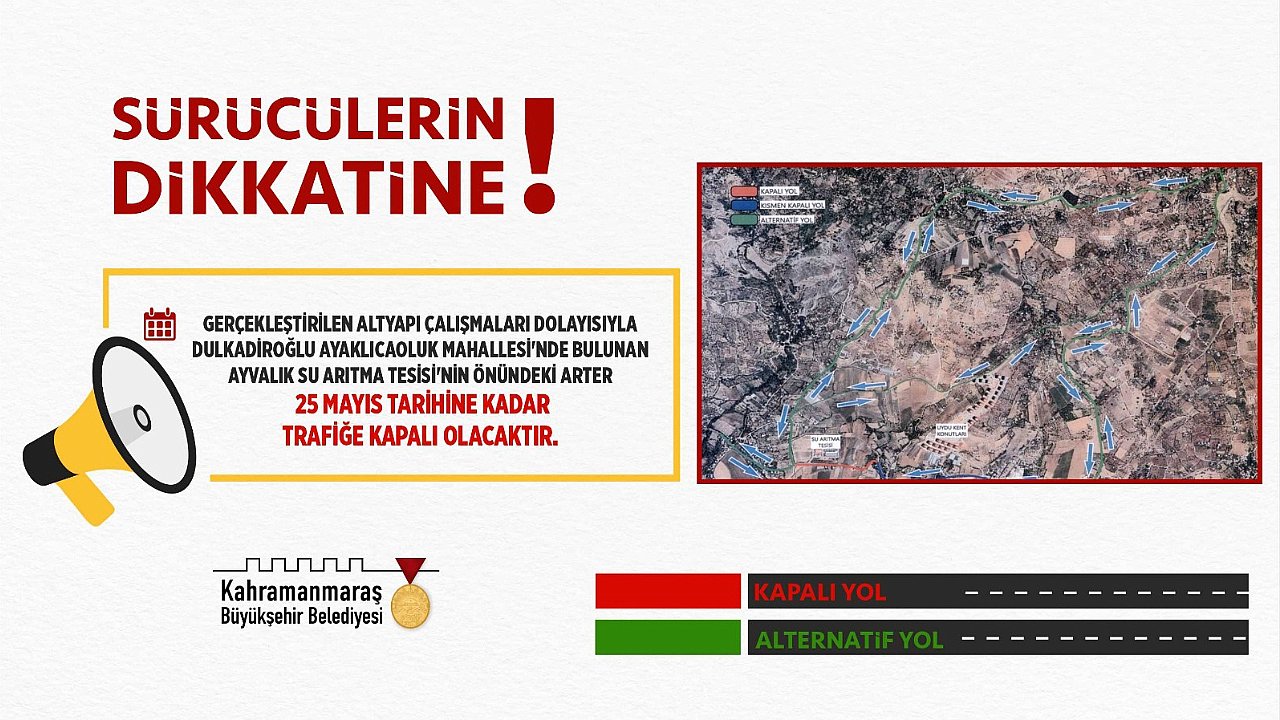 Büyükşehir Belediyesi, gerçekleştirilen altyapı çalışmaları dolayısıyla Kahramanmaraş – Çağlayancerit güzergâhı üzerinde bulunan Ayvalık Su Arıtma Tesisi’nin önündeki arterin 25 Mayıs tarihine kadar trafiğe kapalı olacağını duyurdu.