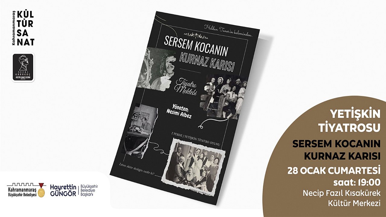 Sezai Karakoç Kültür Sanat Sezonu’nda çeşitli etkinlikleri Kahramanmaraşlılarla buluşturan Büyükşehir Belediyesi, 28 Ocak Cumartesi günü NFK Kültür Merkezi’nde ‘Sersem Kocanın Kurnaz Karısı’ adlı tiyatro gösterisi düzenleyecek.