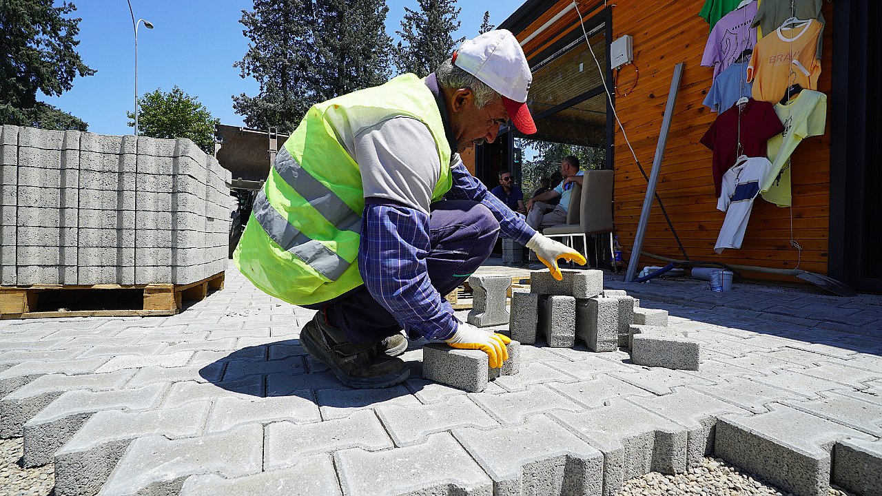 Ekipler, toplamda 30 geçici iş yerinden oluşan ve kura çekimiyle hak sahiplerine teslim edilen geçici çarşıda kilit parke uygulamalarını sürdürüyor. Yoğun bir şekilde sürdürülen çalışmalarla bölgeye toplamda 2 bin metrekare kilit parke ve bordür kazandırılacak.