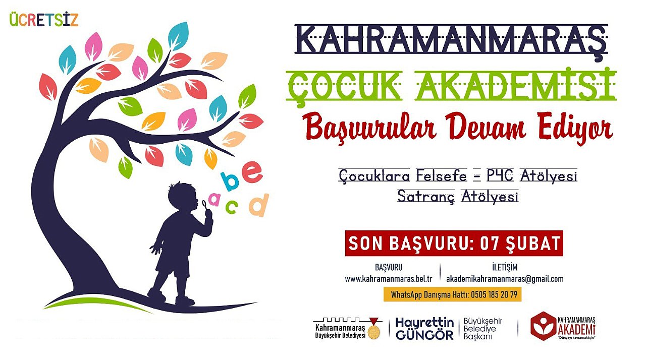 Kahramanmaraş Büyükşehir Belediyesi tarafından çocukların kişisel gelişimlerine katkıda bulunmak ve sosyalleşmelerini sağlamak için hayata geçirilen Kahramanmaraş Çocuk Akademisi’nde yeni dönem ön kayıtları devam ediyor. Akademide, 8-10 yaş arası çocuklar Çocuklarla Felsefe - P4C Atölyesi, 7-12 yaş arası çocuklar ise Satranç Atölyesi’ne başvuru yapabilecek. Büyükşehir Belediyesi’nin internet sitesi üzerinden çevrimiçi olarak yapılanön kayıtlarda son gün 7 Şubat Salı. Kahramanmaraş Çocuk Akademisi başvuru formuna ve atölyelere ilişkin detaylı bilgiye https://kahramanmaras.bel.tr/duyuru/2023/01/21/kahramanmaras-cocuk-akademisi-basvuru-formuinternet adresi üzerinden ulaşılabiliyor.