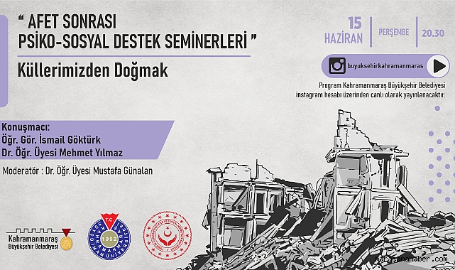 Büyükşehir Belediyesi’nin Afet Sonrası Psiko-Sosyal Destek Seminerleri, 15 Haziran Perşembe günü KSÜ Öğr. Gör. İsmail Göktürk ve Dr. Öğr. Üyesi Mehmet Yılmaz’ın katılımıyla gerçekleştirilecek ‘Küllerimizden Doğmak’ temalı konferansla devam edecek.