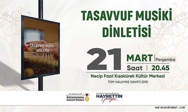 Şiir ve edebiyatın başkentinde Ramazan ayında da kültür sanat faaliyetlerini kesintisiz sürdüren Kahramanmaraş Büyükşehir Belediyesi, 21 Mart Perşembe günü Necip Fazıl Kısakürek Kültür Merkezi’nde tasavvuf musiki dinletisi düzenleyecek. Saat 20.45’te başlayacak etkinlikte saz heyeti, seslendireceği ezgilerle dinleyicilere müzik ziyafeti sunacak. Birbirinden değerli tasavvufi eserlerin seslendirileceği geceye tüm vatandaşlar davet edilirken, Ramazan ayı boyunca düzenlenecek etkinliklere https://kahramanmaras.bel.tr/duyuru/2024/03/06/ramazan-ayi-etkinlik-takvimi internet adresinden ulaşılabileceği belirtildi.