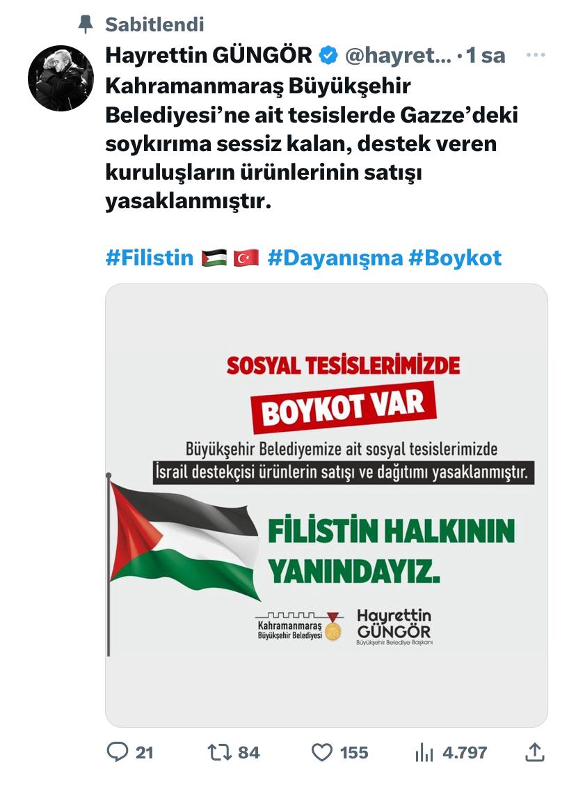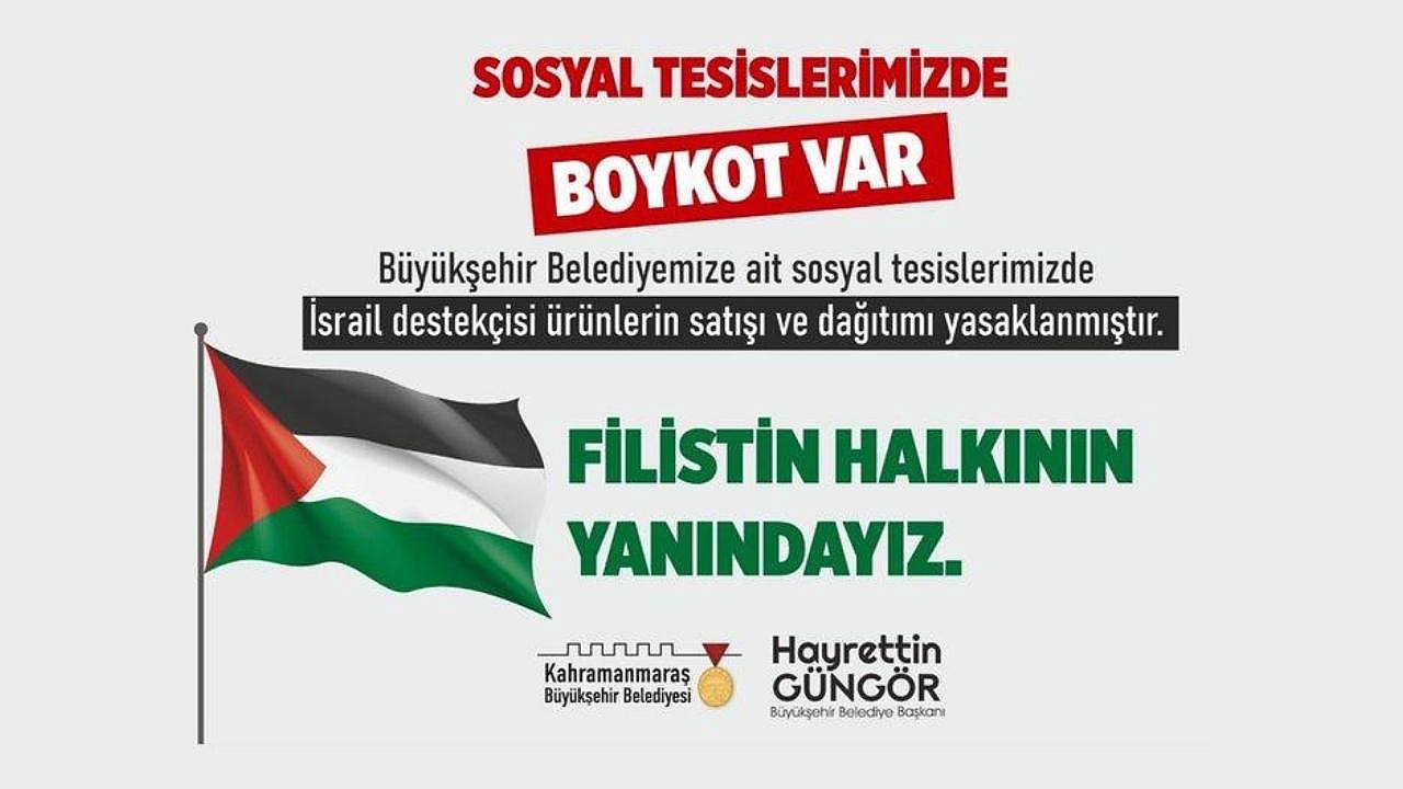 Kahramanmaraş Büyükşehir Belediyesi, İsrail’in Filistin’de yaptığı saldırı ve soykırıma sessiz kalmadı. Büyükşehir Belediye Başkanı Hayrettin Güngör’ün sosyal medya hesabından yapılan paylaşımda, Büyükşehir Belediyesine ait tesislerde, İsrail destekçisi ürünlerin satışı ve dağıtımının yasaklandığı belirtildi. Paylaşımda, “Kahramanmaraş Büyükşehir Belediyesine ait tesislerde Gazze’deki soykırıma sessiz kalan, destek veren kuruluşların ürünlerinin satışı yasaklanmıştır. Filistin halkının yanındayız” ifadelerine yer verildi. Büyükşehir Belediye Başkanı Hayrettin Güngör’ün paylaşımı ve karar, sosyal medya kullanıcılarının büyük beğenisini kazandı ve takdirini topladı.