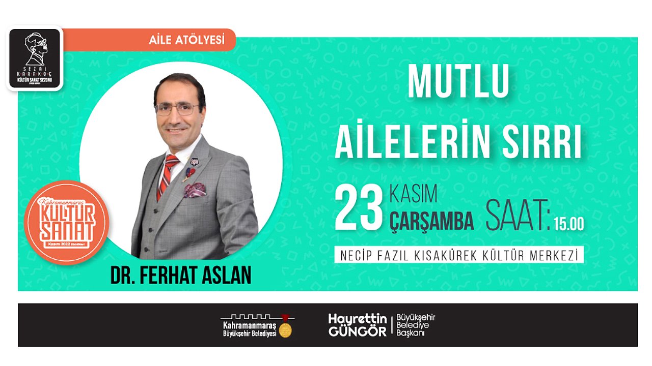 Kültür sanat etkinlikleri kapsamında 23 Kasım Çarşamba günü Necip Fazıl Kısakürek Kültür Merkezi’nde ‘Mutlu Ailelerin Sırrı’ temalı söyleşide Aile Danışmanı Dr. Ferhat Aslan, Kahramanmaraşlılarla bir araya gelecek. Saat 15.00’da başlayacak etkinlikte Dr. Aslan; aile kavramı, ailede mutluluğun yakalanması, çocukların pedagojik gelişimi ve ebeveynlerin çocukların hayatına etkisi gibi pek çok konuyu farklı açılardan ele alacak. Büyükşehir Belediyesi’nden yapılan açıklamada, 23 Kasım Çarşamba günü gerçekleştirilecek her iki etkinliğe de tüm Kahramanmaraşlıların davetli olduğu belirtildi.