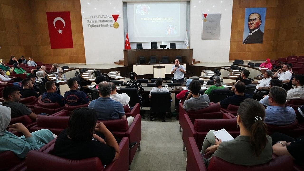 Personelin bilgi ve becerilerini artırarak hizmet kalitesini daha da üst seviyeye çıkarmak için faaliyetlerini sürdüren Kahramanmaraş Büyükşehir Belediyesi, Türkiye Belediyeler Birliği iş birliğiyle personellere yönelik hizmet içi eğitim düzenledi. İnsan Kaynakları ve Eğitim Dairesi Başkanlığı’nca koordine edilen eğitimlerde Prof. Dr. Enver Aydoğan ve Cem Ogün Şen tarafından personellere; etkili ve doğru iletişim, stres yönetimi, motivasyon, drama ve protokol kuralları gibi pek çok konuda bilgiler aktarıldı. Büyükşehir Belediyesi’nden yapılan açıklamada, personelin bilgi ve becerileriyle doğru orantılı olarak hizmetin niteliğinin de artırılması noktasında eğitimlerin devam edeceği belirtildi.