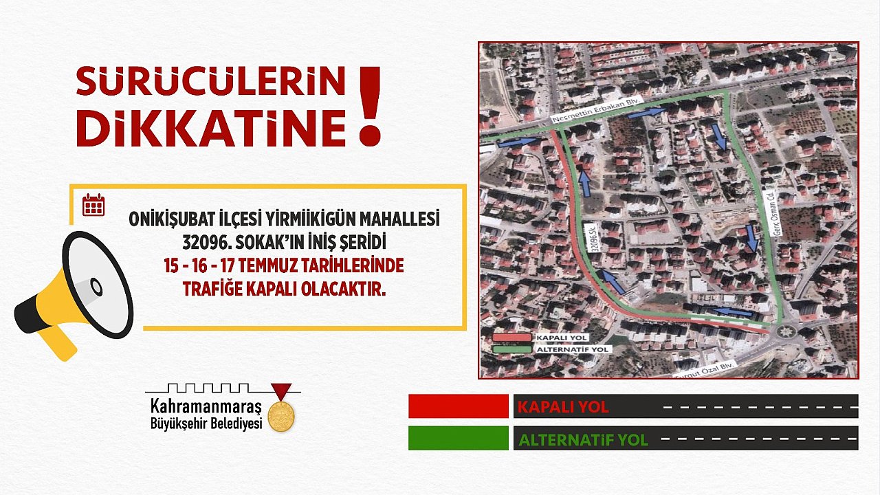 Büyükşehir Belediyesi, asfalt yenileme çalışmaları dolayısıyla Onikişubat ilçesi Yirmiikigün Mahallesi’nde bulunan 32096. Sokak’ın iniş şeridinin 15 – 16 – 17 Temmuz tarihlerinde trafiğe kapalı olacağını duyurdu.