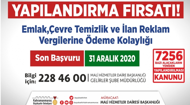 Kahramanmaraş Büyükşehir Belediyesi, ‘7256 Sayılı Bazı Alacakların Yeniden Yapılandırılması Kanunu’ kapsamında tüm vergi kalemlerinde vatandaşlara kolaylık sağlıyor.